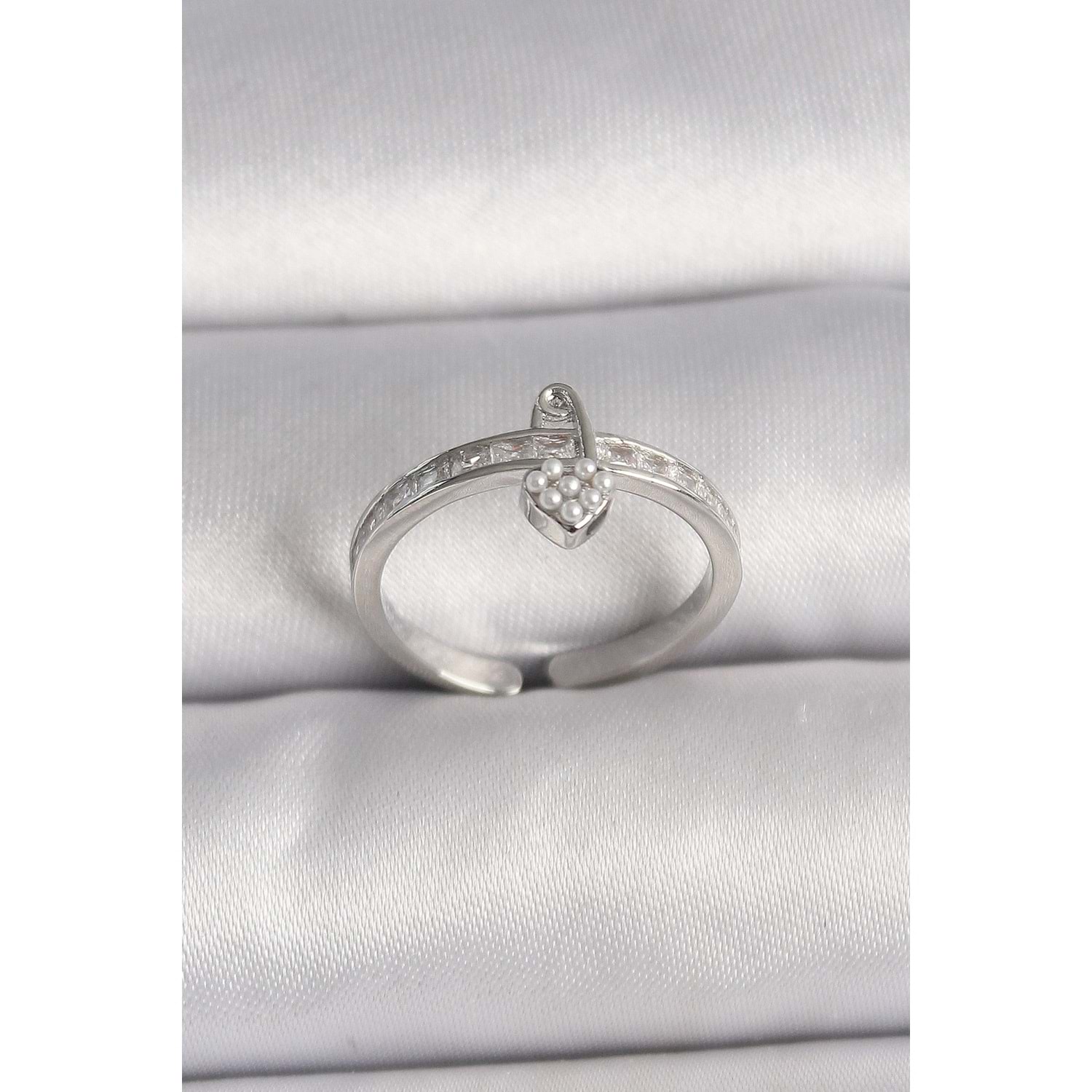 Pirinç Gümüş Renk Zirkon Taşlı İnci Detaylı Kilit Kalp Model Ayarlanabilir Yüzük