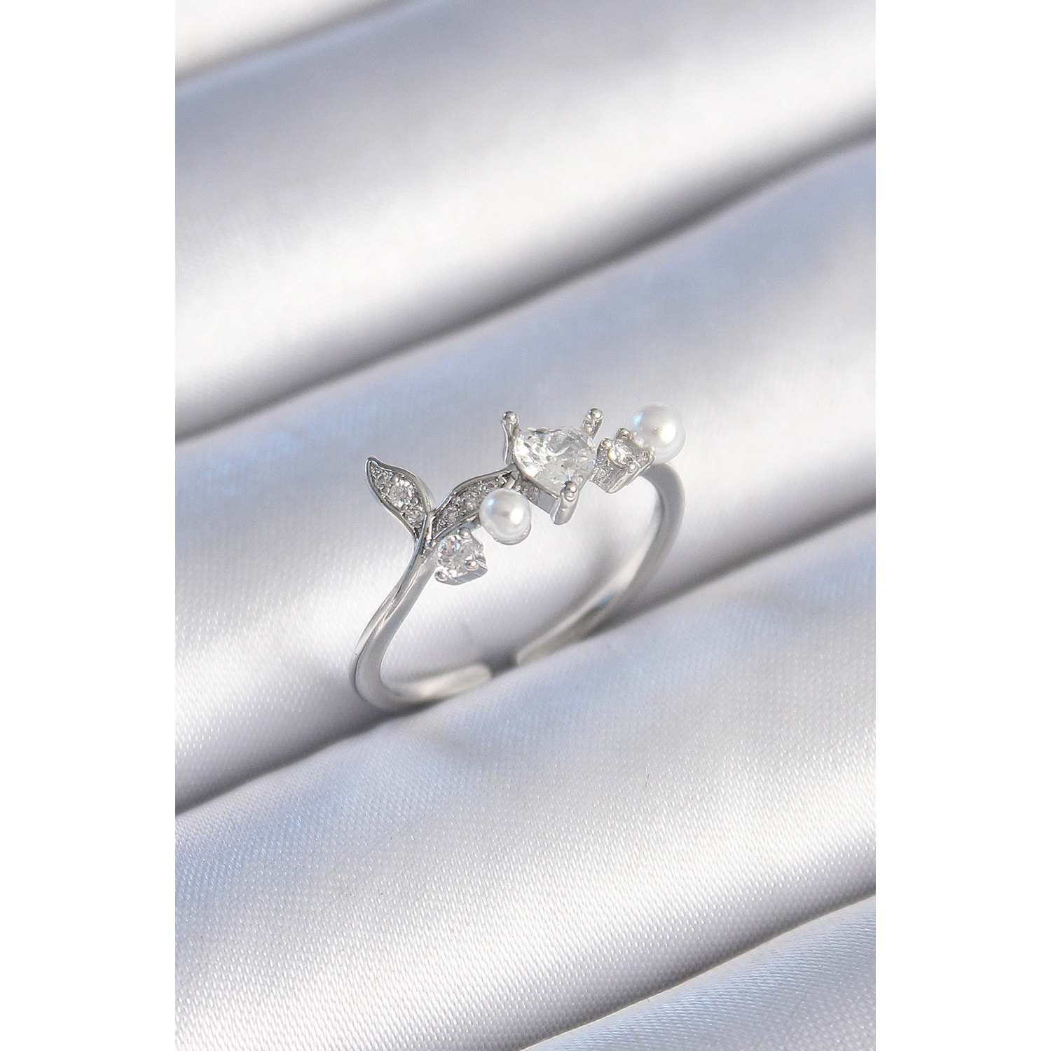 Pirinç Gümüş Renk Zirkon Taşlı Kalp Yaprak Model İnci Detay Kadın Yüzük
