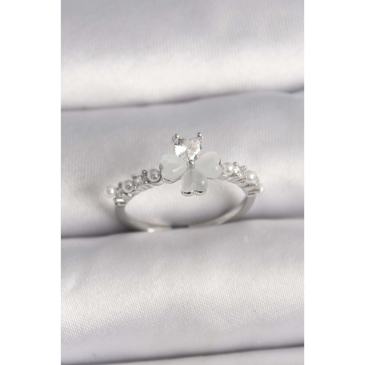 Pirinç Gümüş Renk Zirkon Taşlı Yonca Model İnci Detay Ayarlanabilir Yüzük