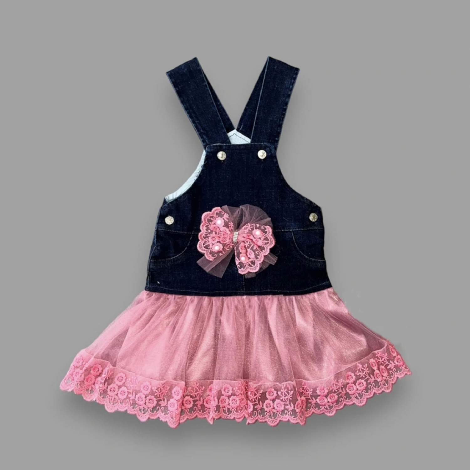 2-3-4 Yaş Fiyonklu Düğme Detaylı Tül Etek Kot Kumaş Salopet Kız Çocuk Elbisesi