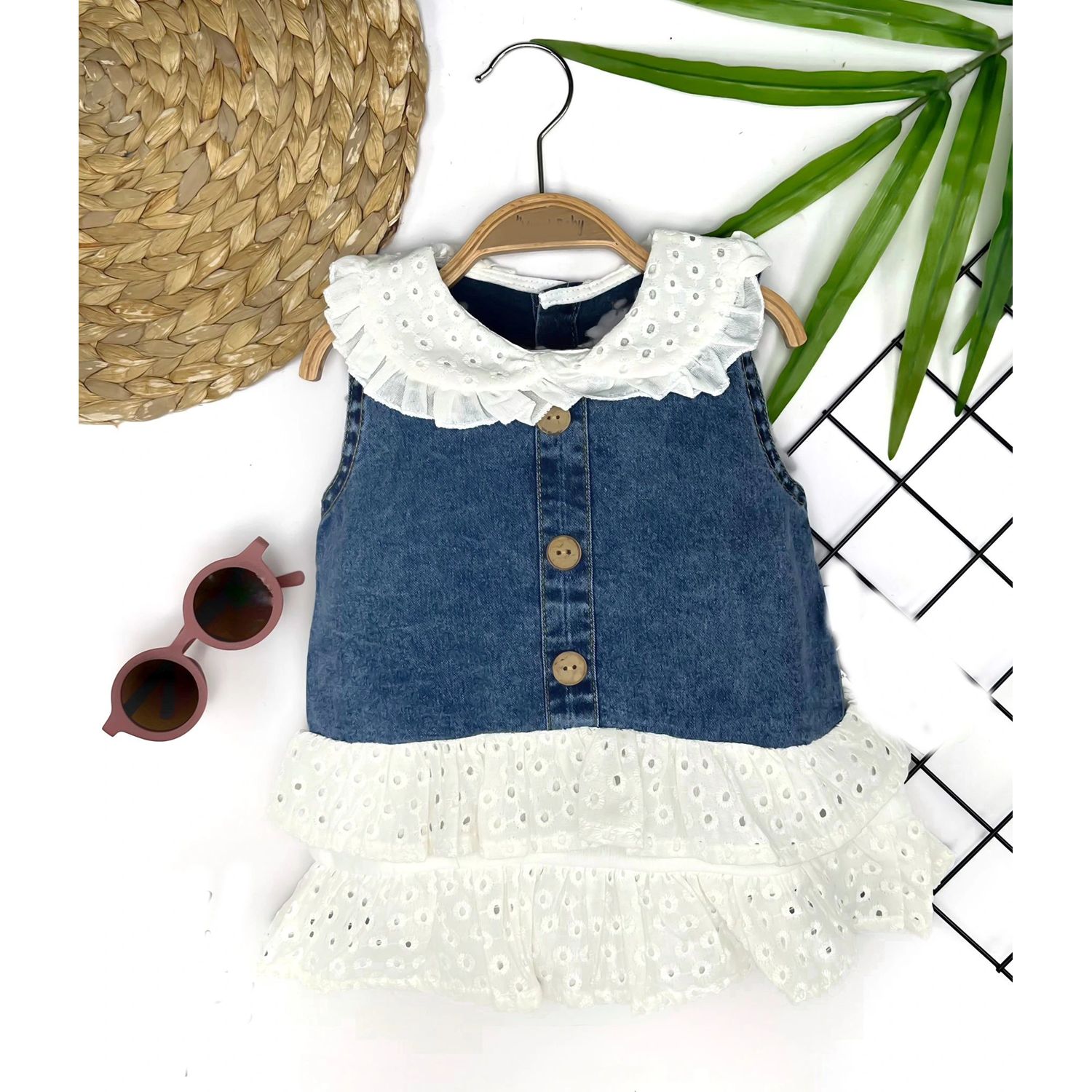 6-9-12-18 Ay Güpür Yaka Ve Etek Detaylı Kot Kilotlu Etek Kız Bebek Elbisesi