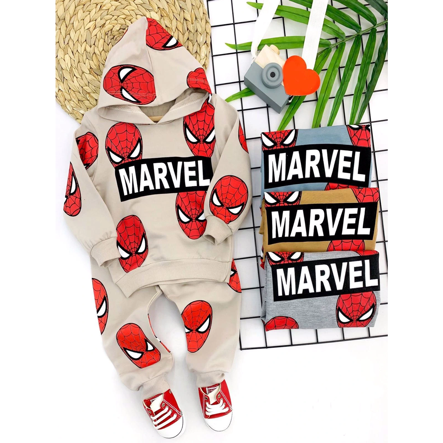 9-12-18-24 Ay Kapşonlu Örümcek Adam Baskılı Uzun Kollu 3lü Kız Erkek Bebek Takımı