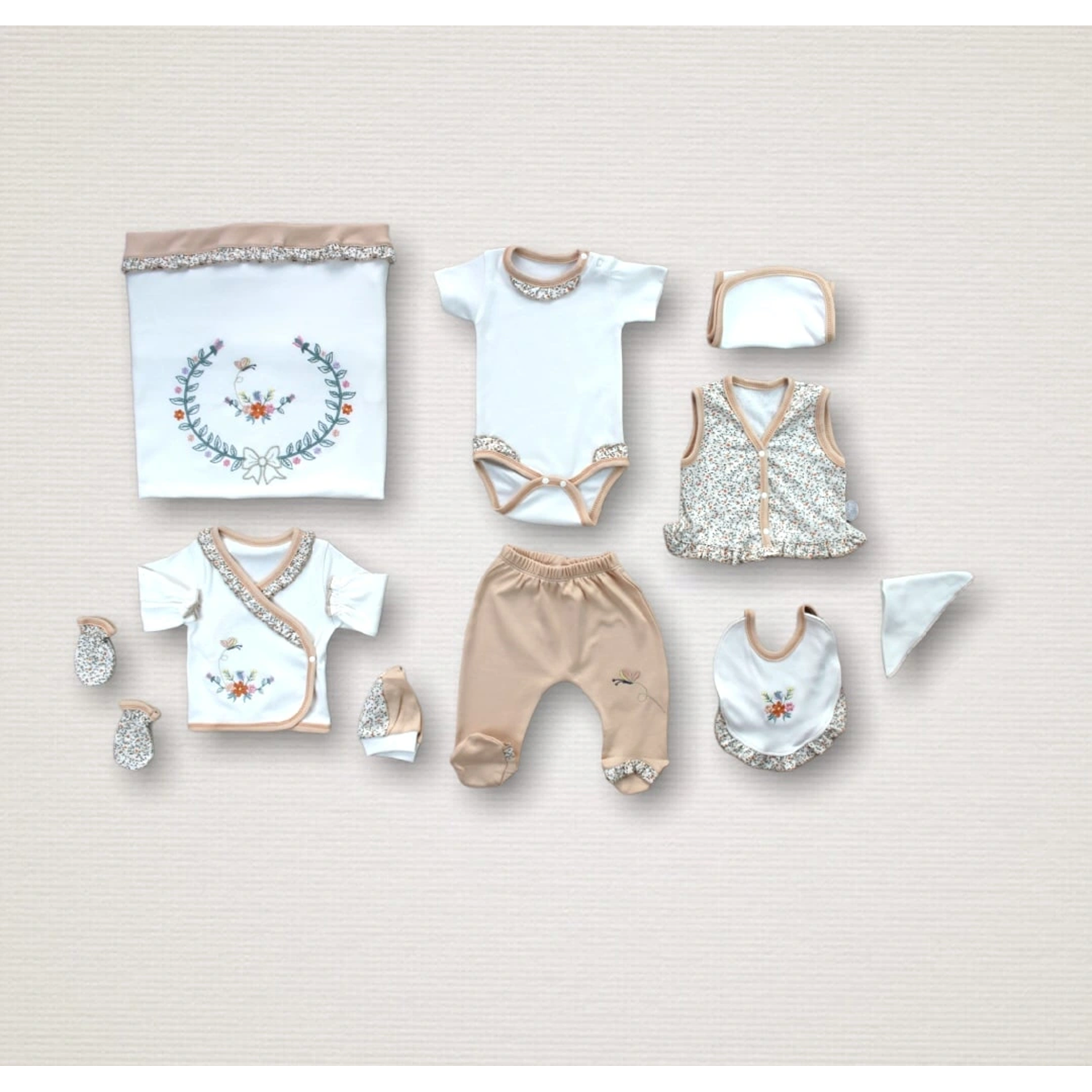 Erguvan Taç Nakışlı %100 Cotton Antibakteriyel Kız Bebek 10lu Zıbın Takımı Hastane Çıkışı