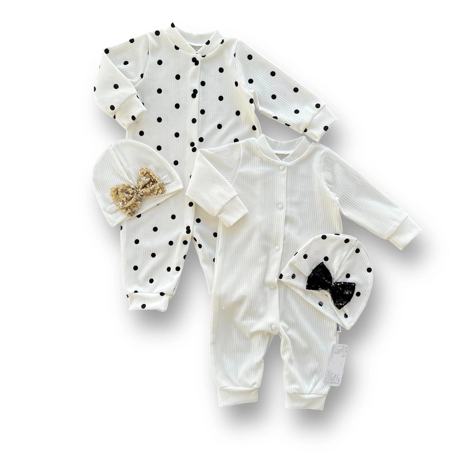 0-3 3-6 6-9 Ay Payetli Şapka Çıtçıt Kapamalı Puantiyeli Ve Düz 2 Li Kombin Kız Bebek Tulumları