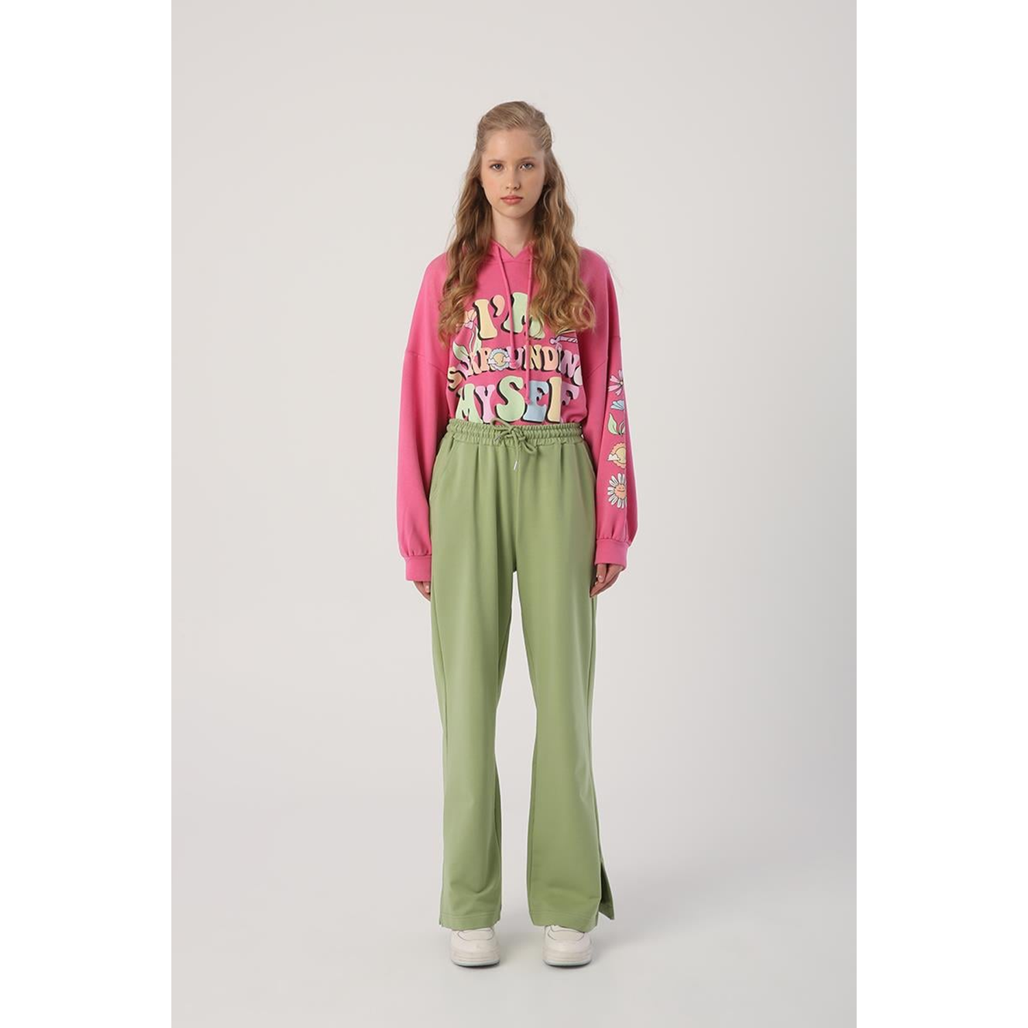 açık yeşil eşofman altı, bol paça eşofman, yırtmaçlı eşofman, rahat kalıp eşofman, pamuklu eşofman altı, lastikli bel eşofman, günlük eşofman, mevsimlik eşofman, kadın eşofman, %72 pamuk eşofman, bağcıklı eşofman