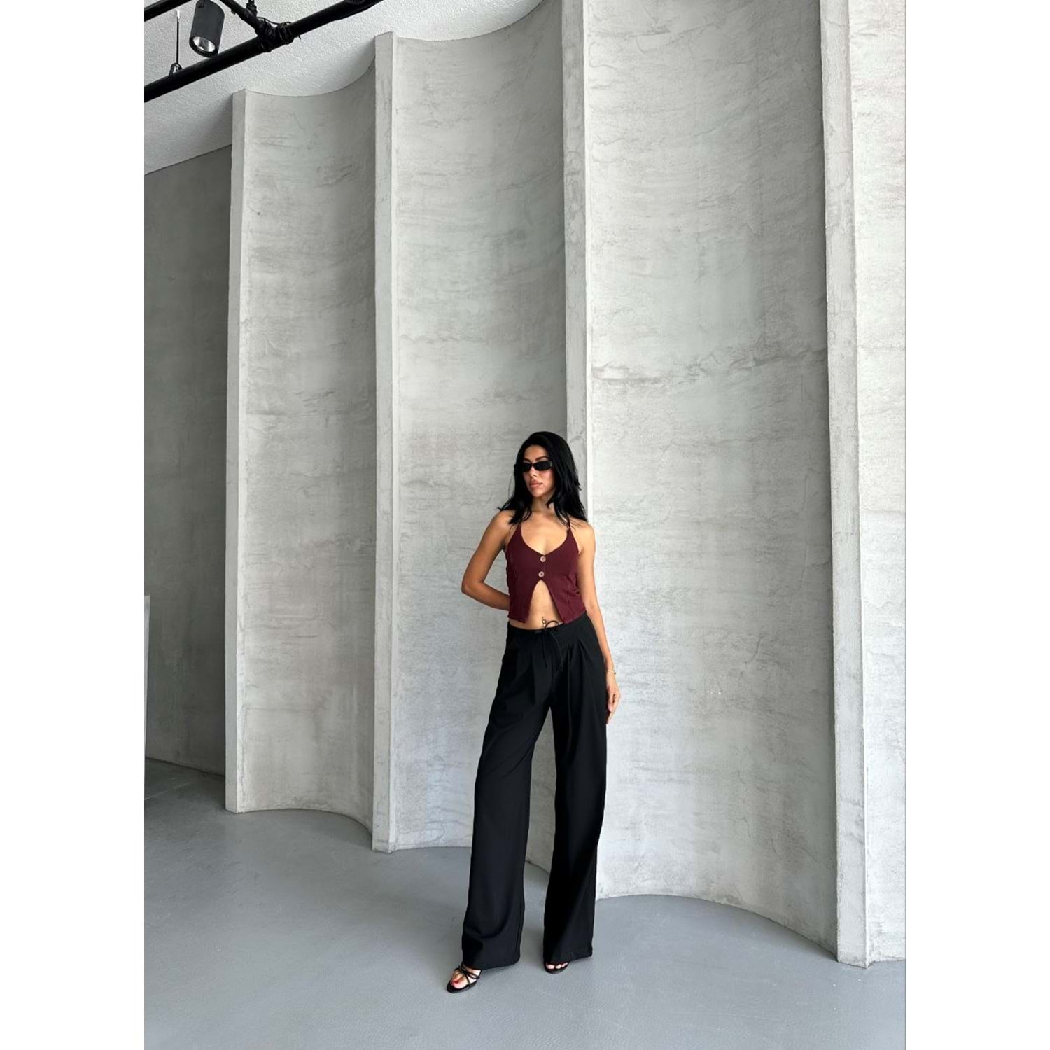 38 Beden Siyah Keten Geniş Paça Pantolon | Beli İpli ve Pileli Model