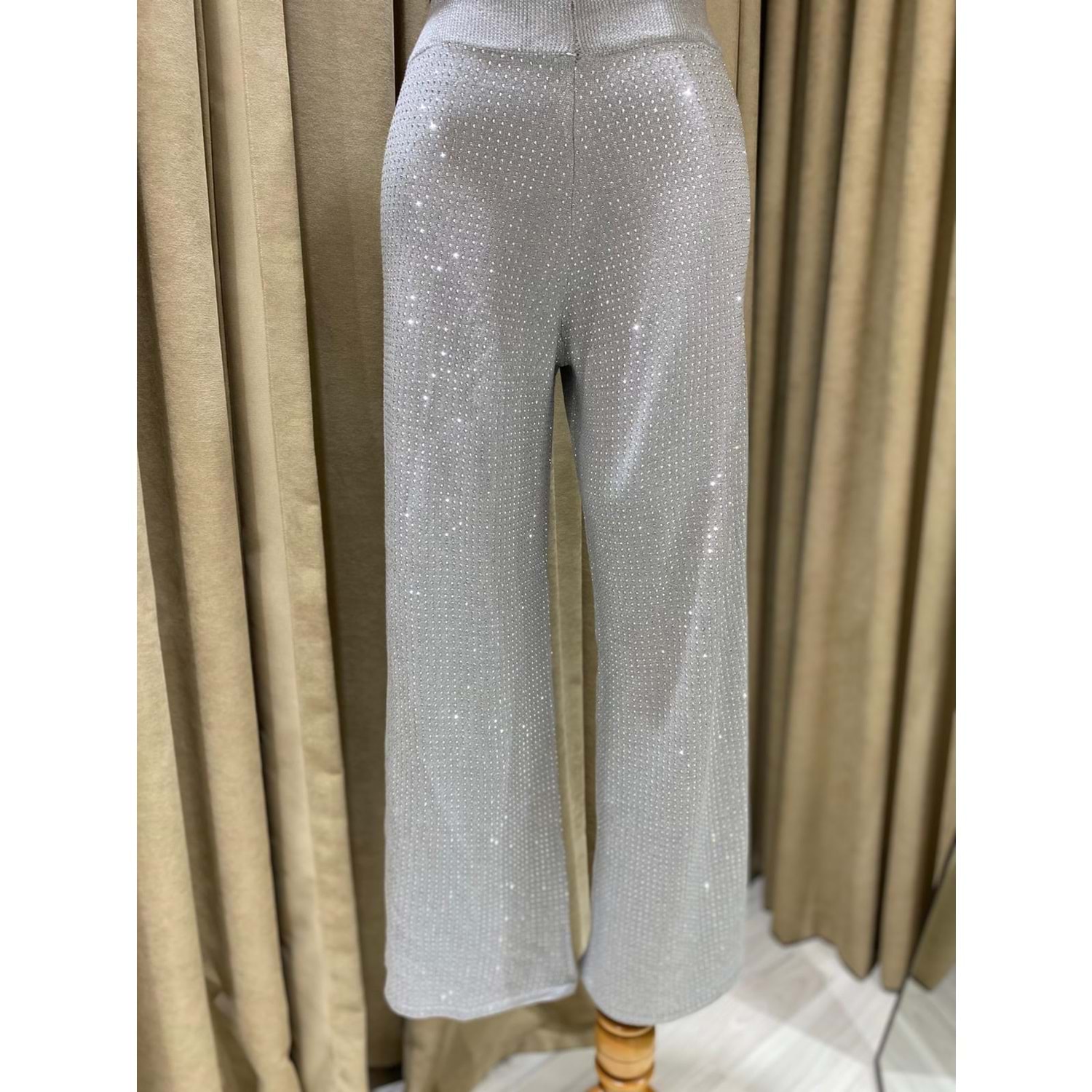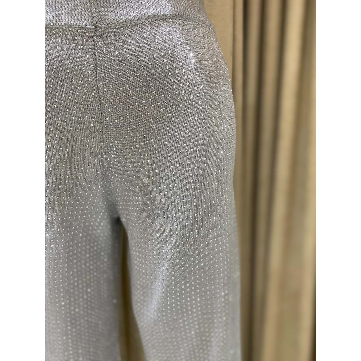 Triko konforuyla ışıltıyı birleştirin! Önü Taşlı, Geniş Paça (Palazzo) Triko Pantolon ile özel davetlerde ve günlük hayatta şıklığı yakalayın. Gri ve Siyah renk seçenekleri, Standart beden (36-42)