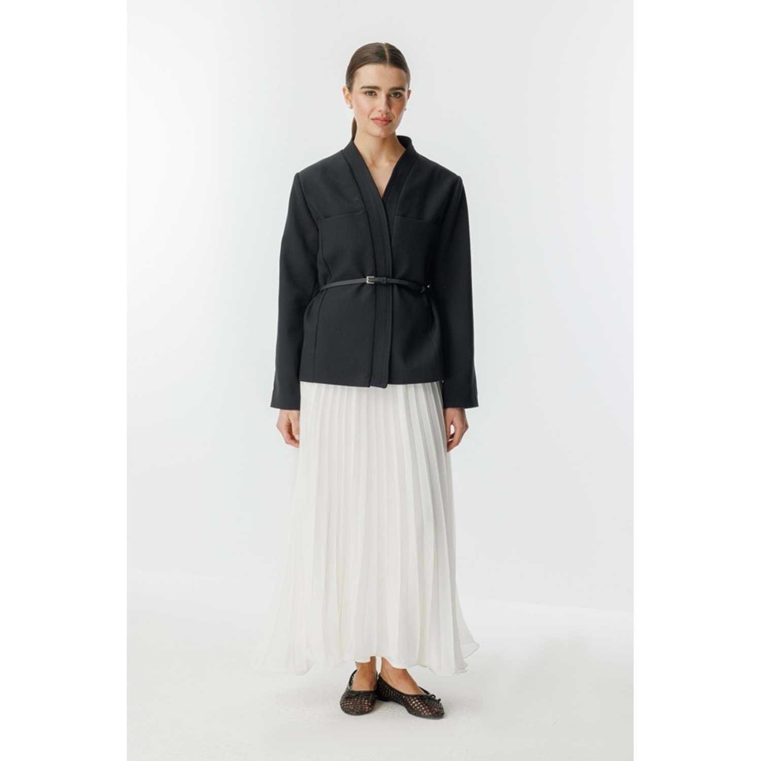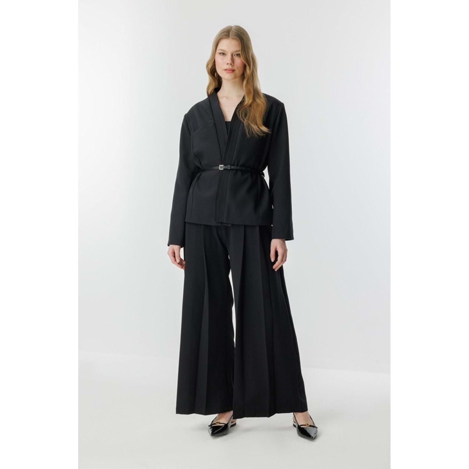 Siyah rengin güçlü duruşunu yansıtan kimono yaka ceket, vatkalı omuz yapısı ve köprülü tasarımıyla şık bir görünüm sunar. Punto dikiş detaylarıyla hareket kazanan model, deri kemeri sayesinde belinizi vurgular. Astarlı yapısı ve L/XL beden ölçüleriyle hem şıklığı hem de konforu bir arada sunar.