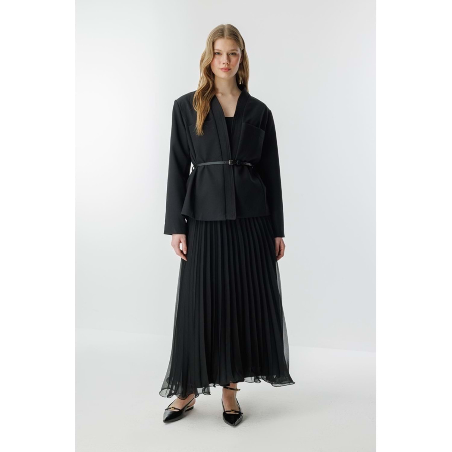 siyah kadın ceket, siyah kimono yaka ceket, punto dikişli siyah ceket, vatkalı siyah ceket, deri kemerli siyah ceket