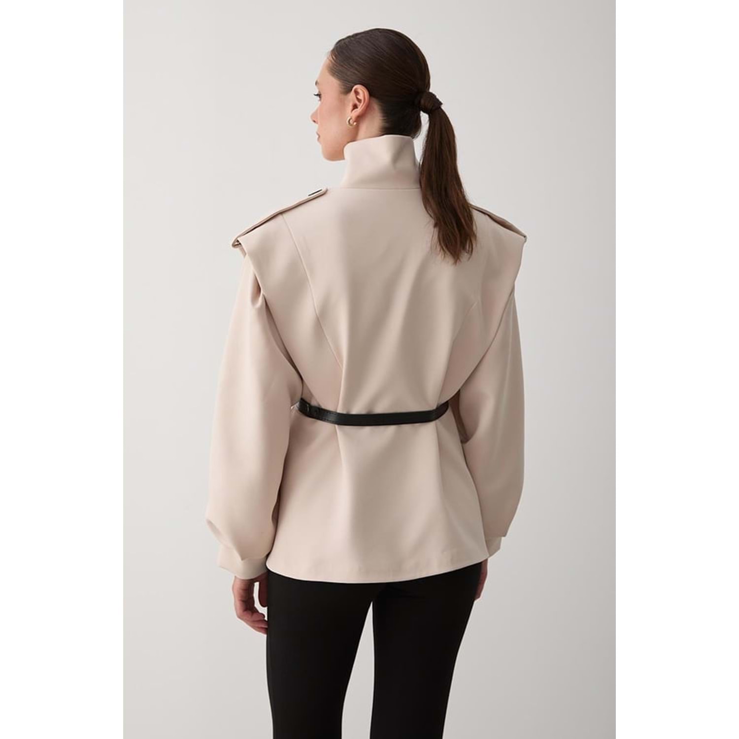 bej büyük beden ceket, tesettür uyumlu ceket, kadın kemerli ceket, pamuk kumaş ceket, şık günlük ceket