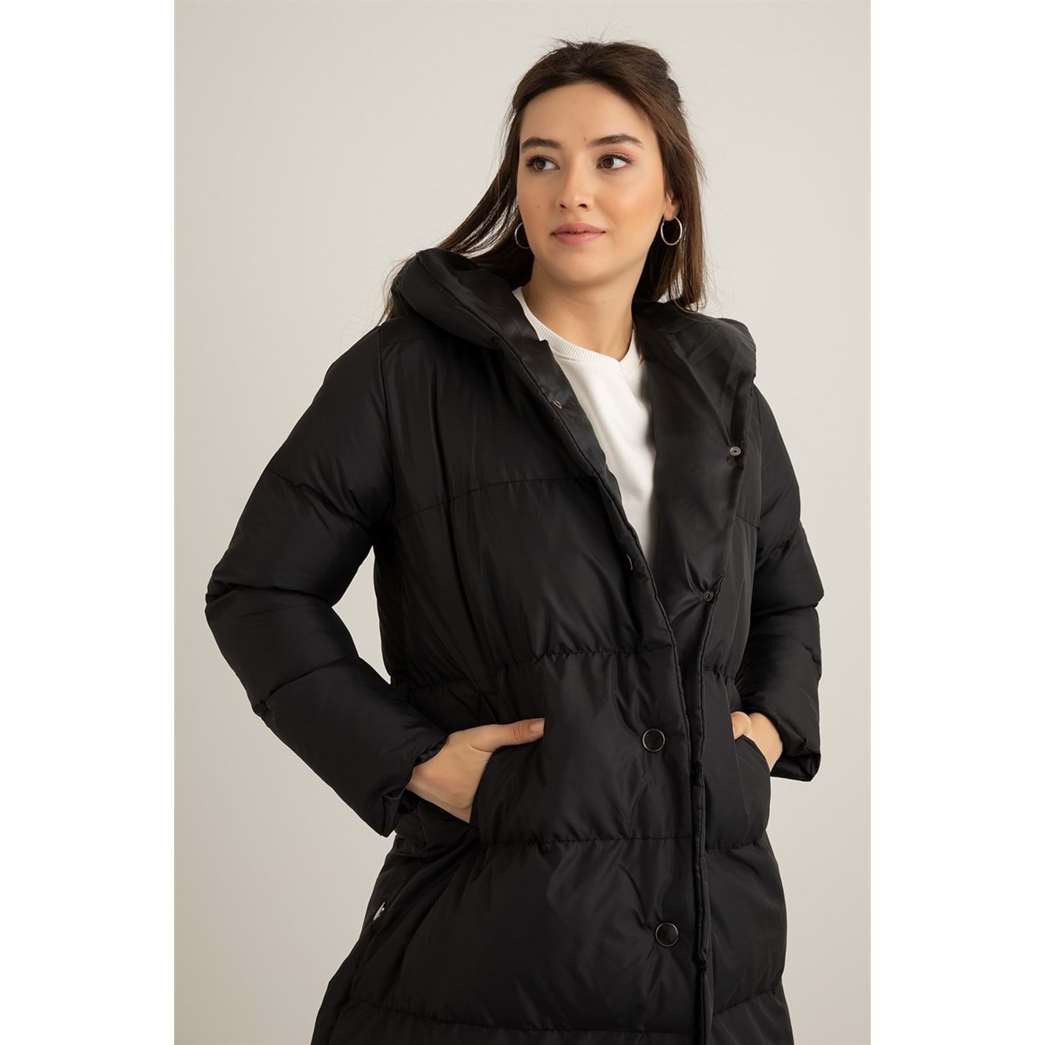 Çıtçıtlı Uzun Şişme Kadın Mont Siyah 42 Beden