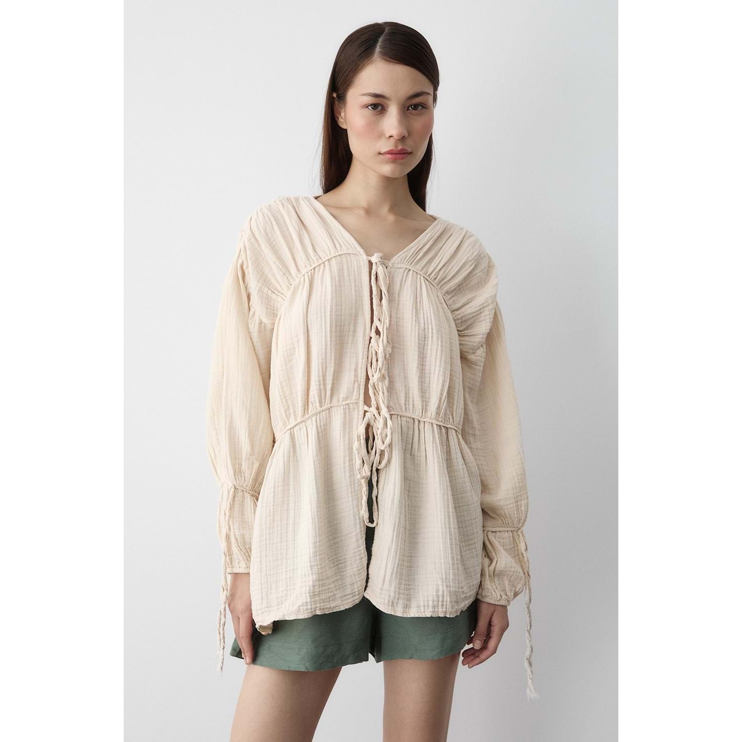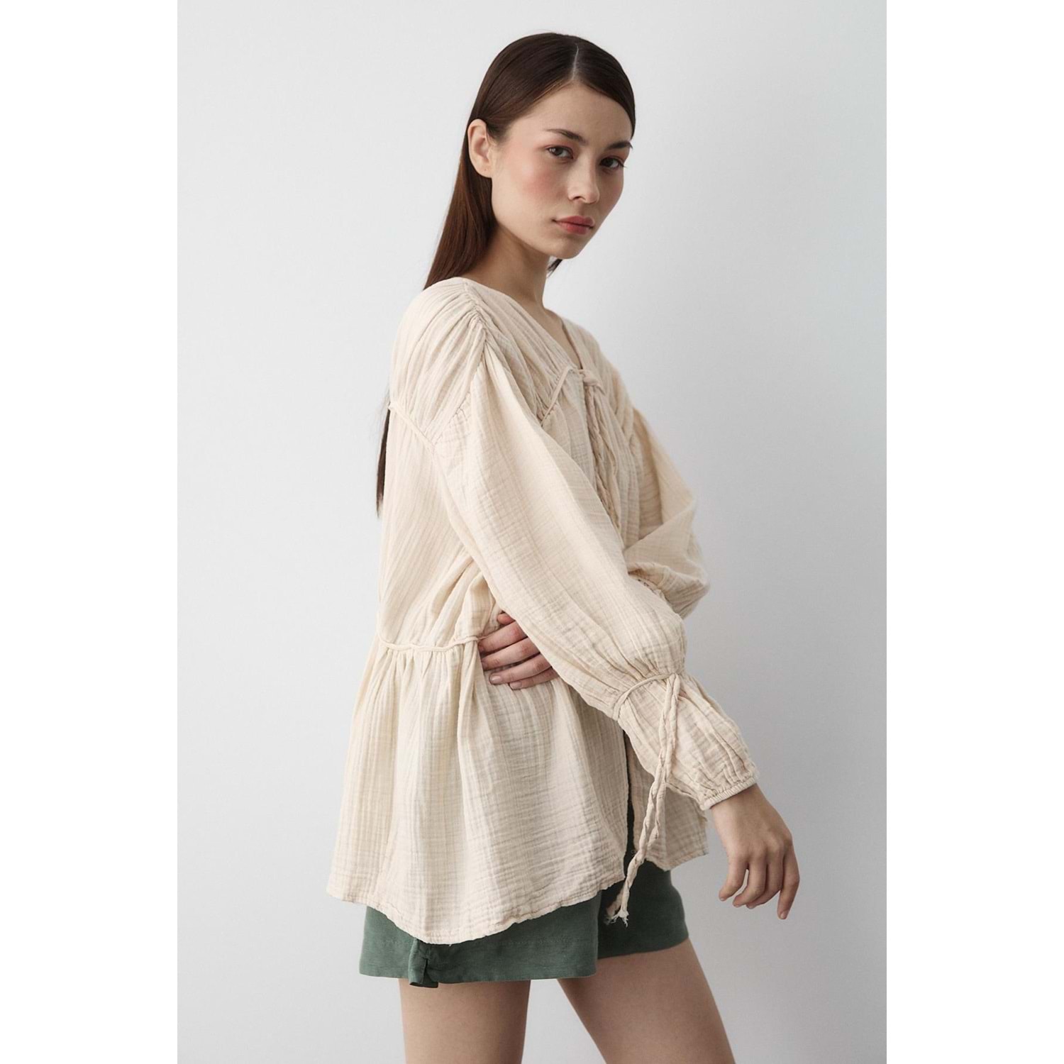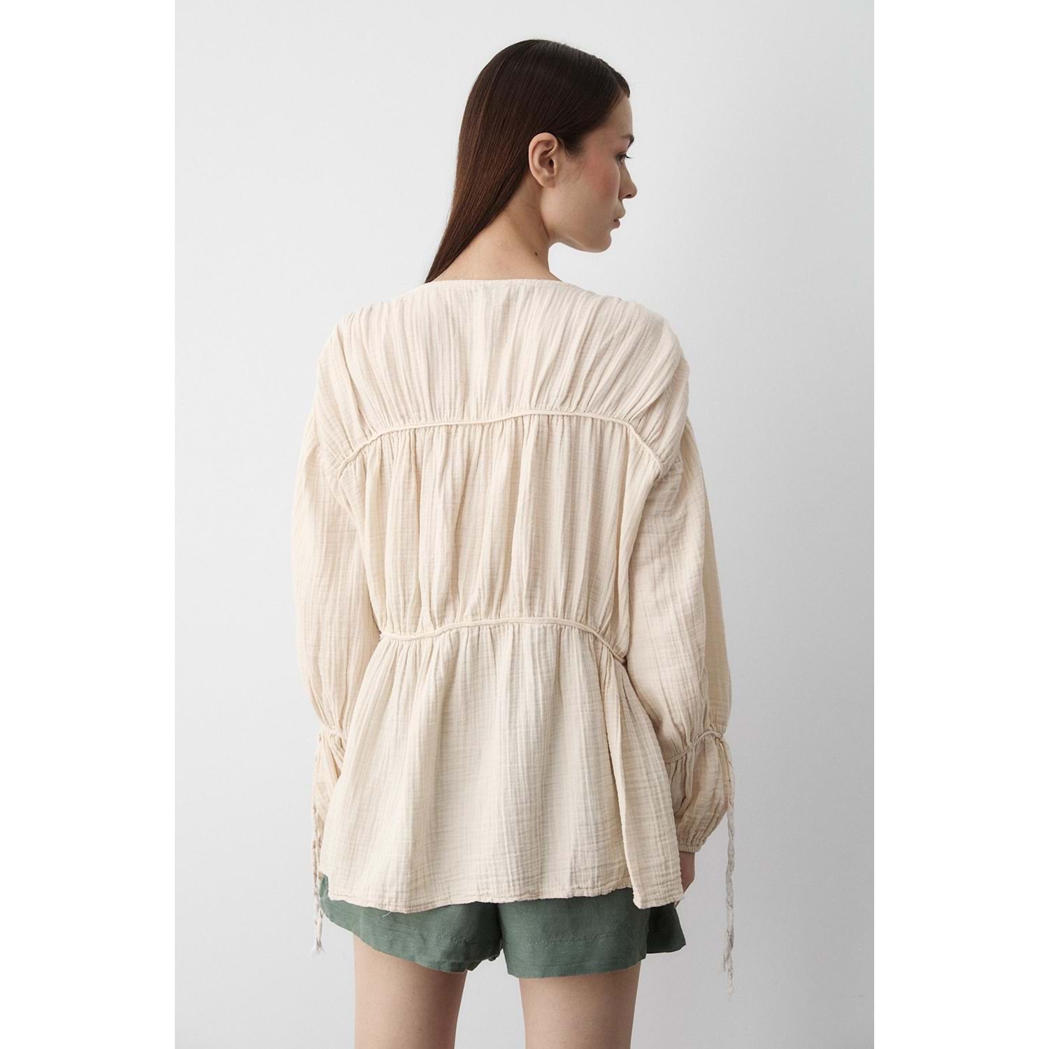 %100 Pamuk Kolu Lastikli Müslin Bağlamalı Bej Bluz M Beden