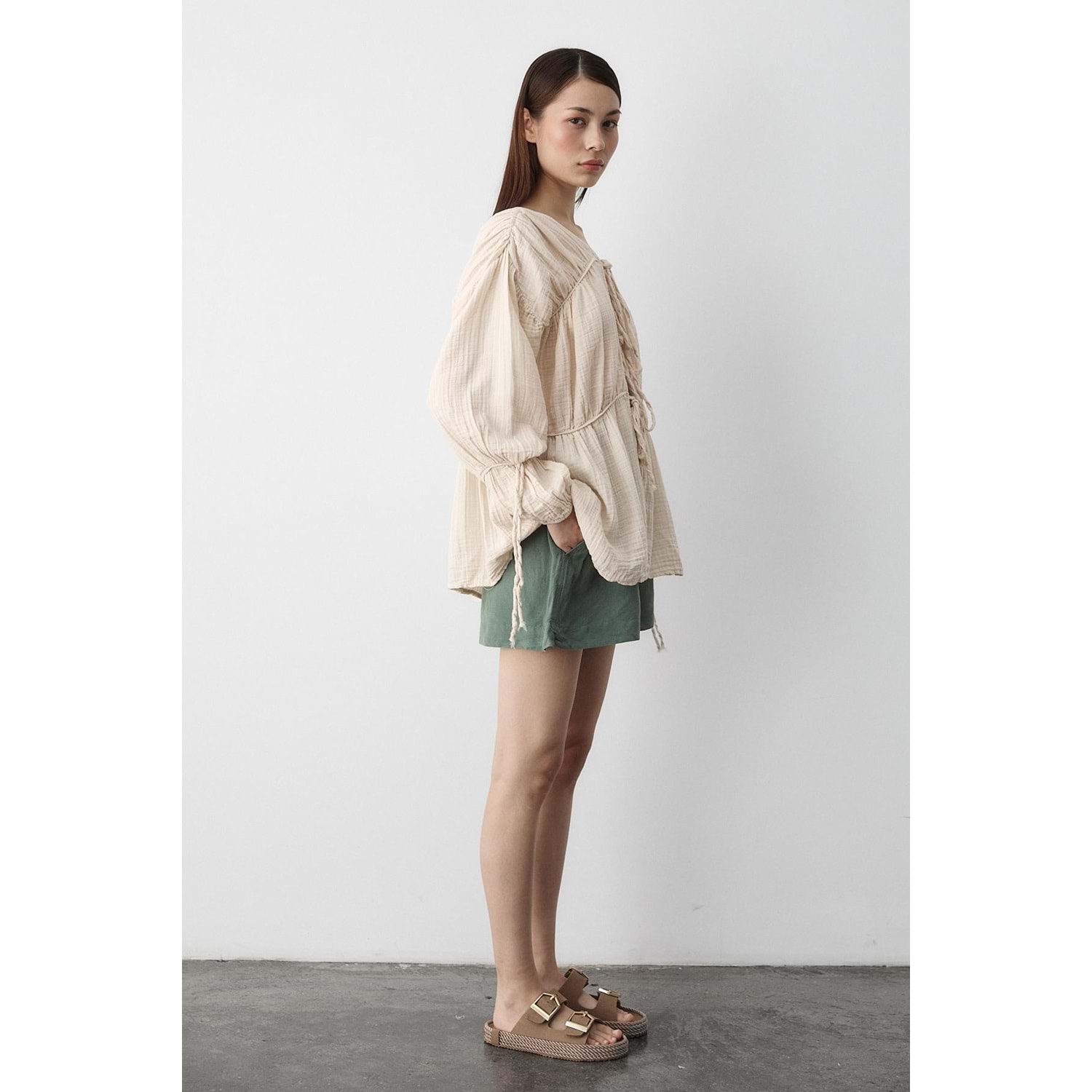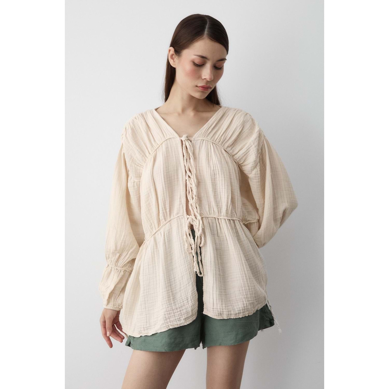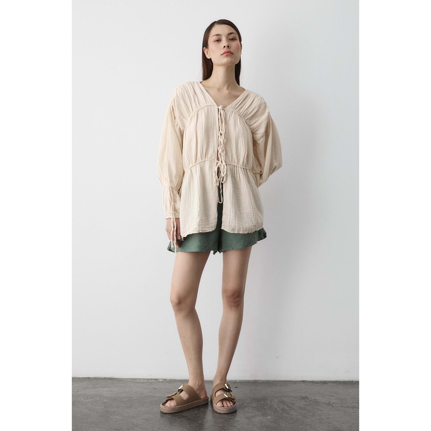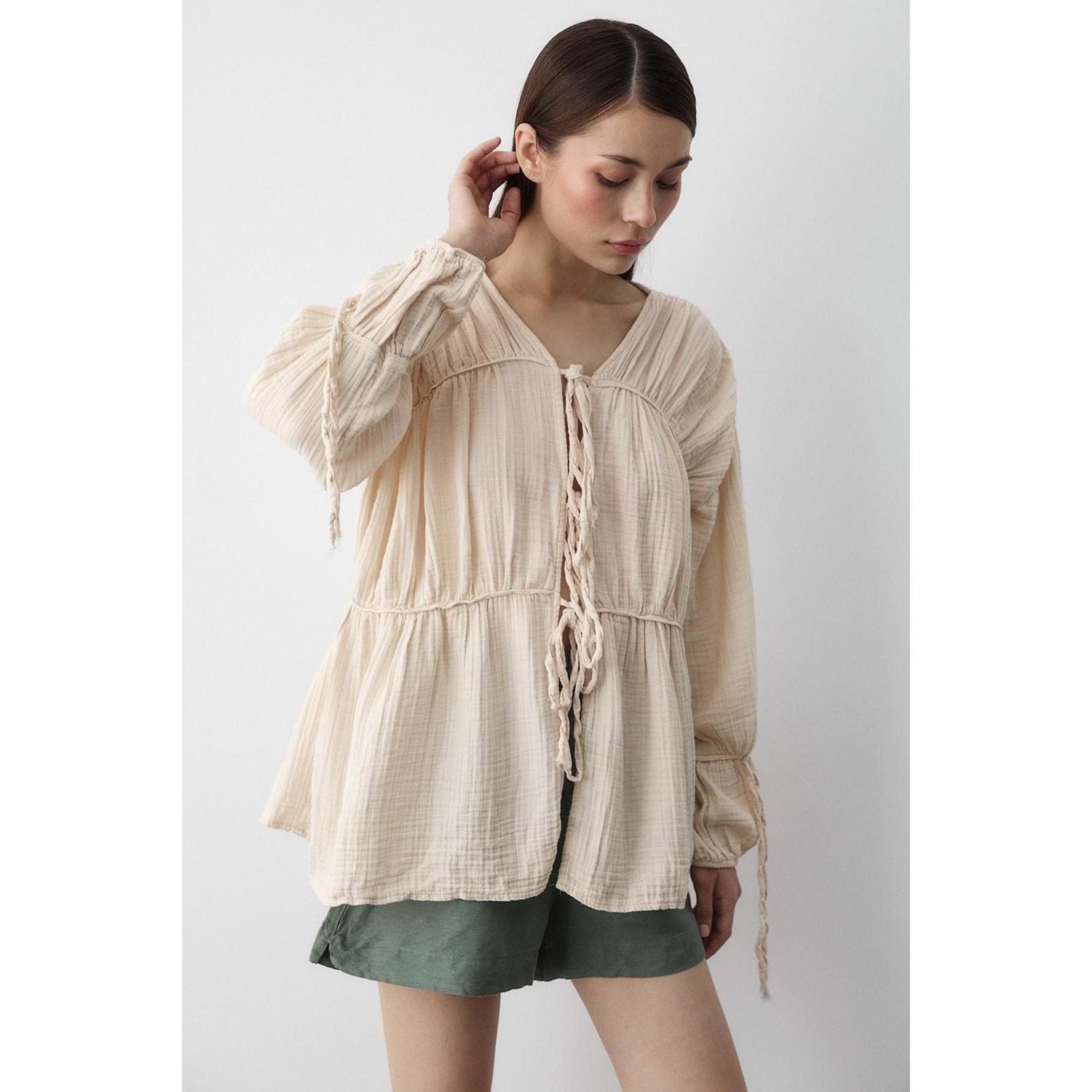 %100 Pamuk Kolu Lastikli Müslin Bağlamalı Bej Bluz M Beden