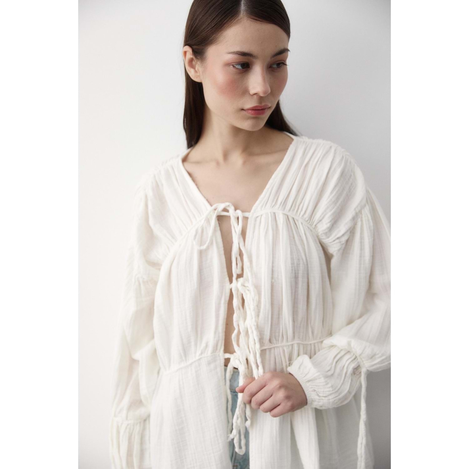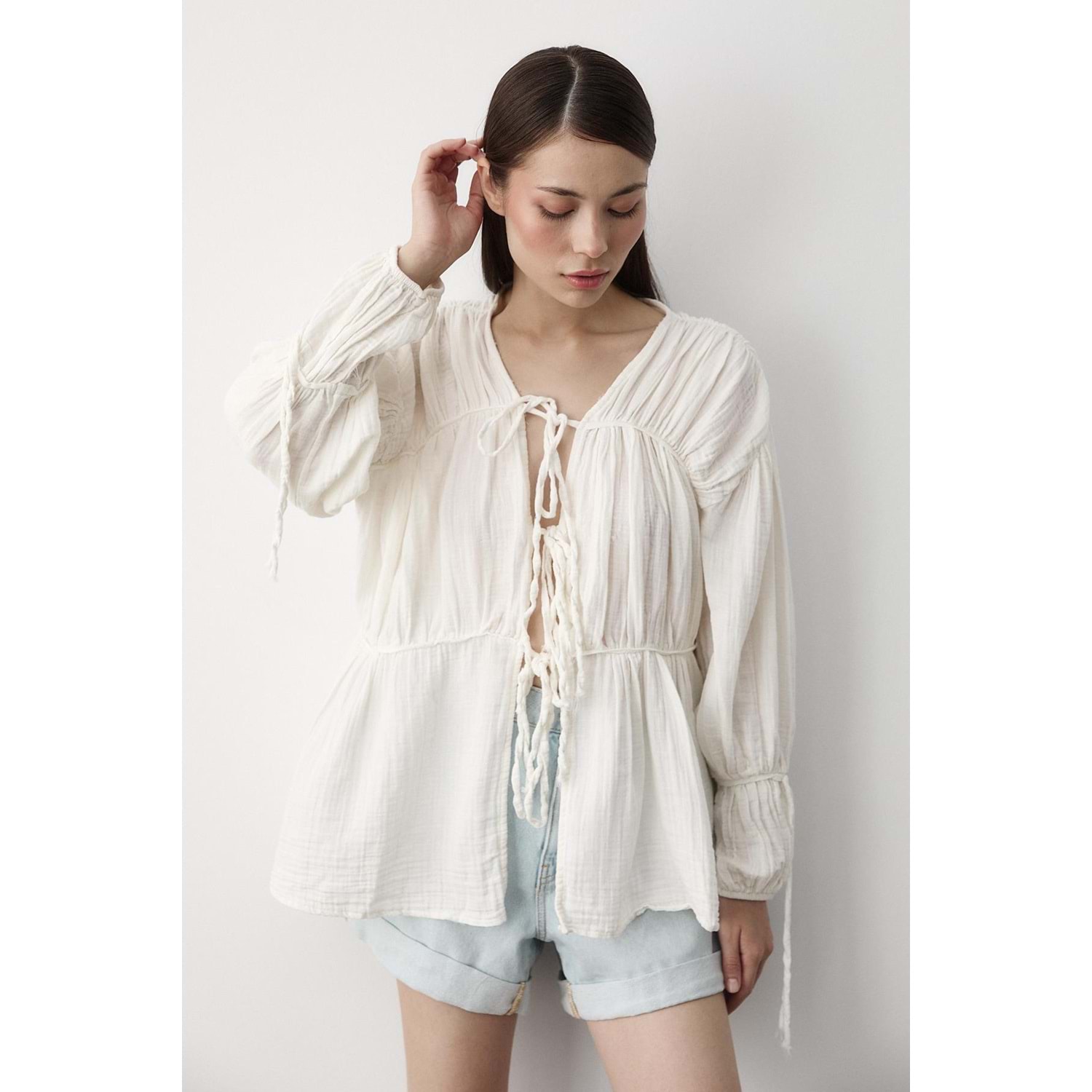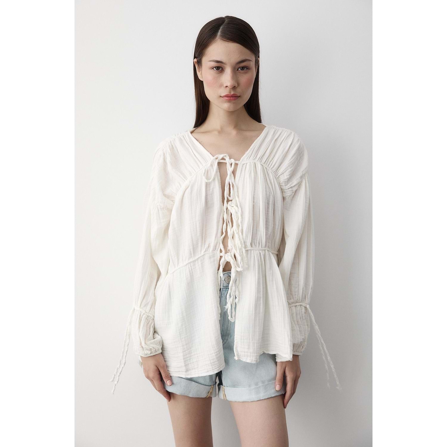 %100 Pamuk Kolu Lastikli Müslin Bağlamalı Beyaz Bluz M Beden