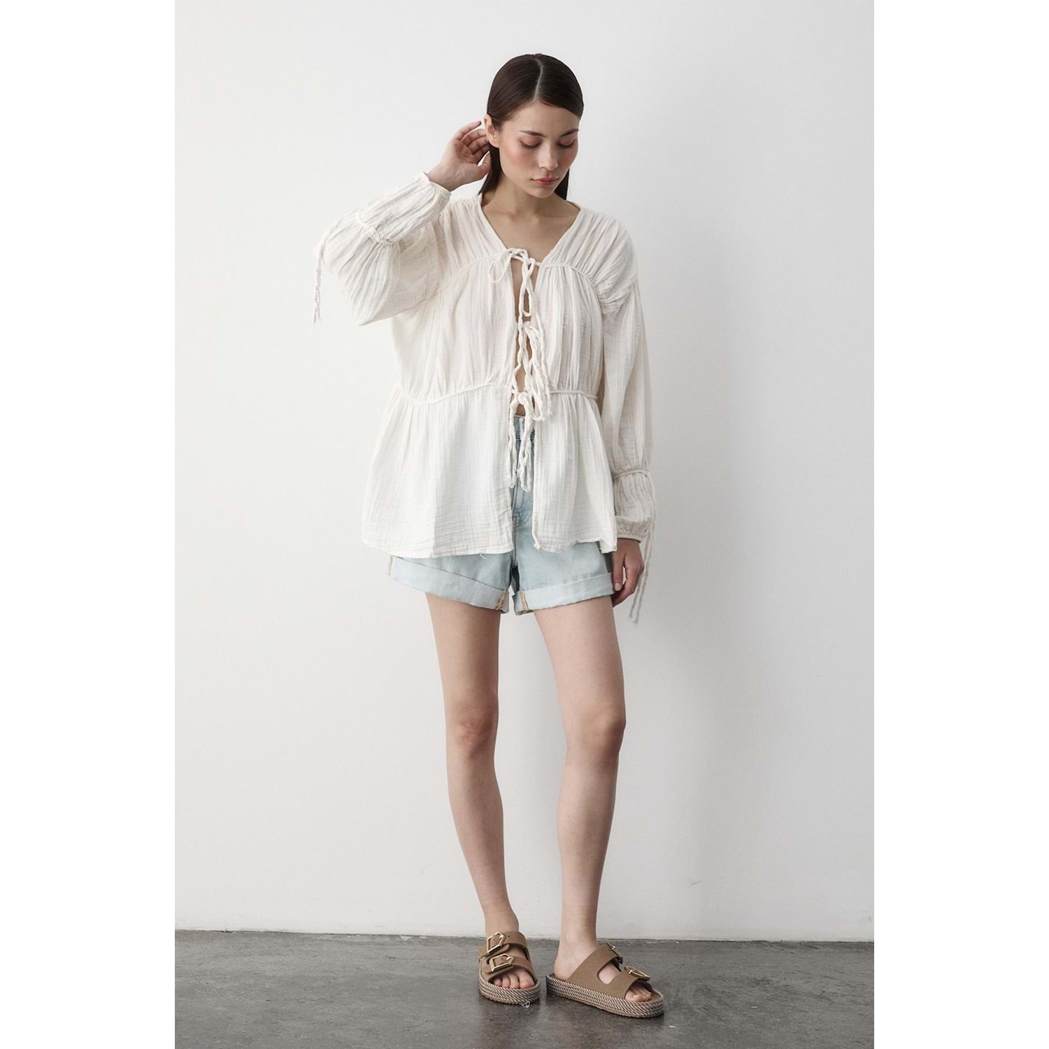 beyaz müslin bluz, beyaz pamuk bluz, beyaz bağlamalı bluz, kadın beyaz bluz, beyaz yazlık bluz, bisqvi beyaz bluz