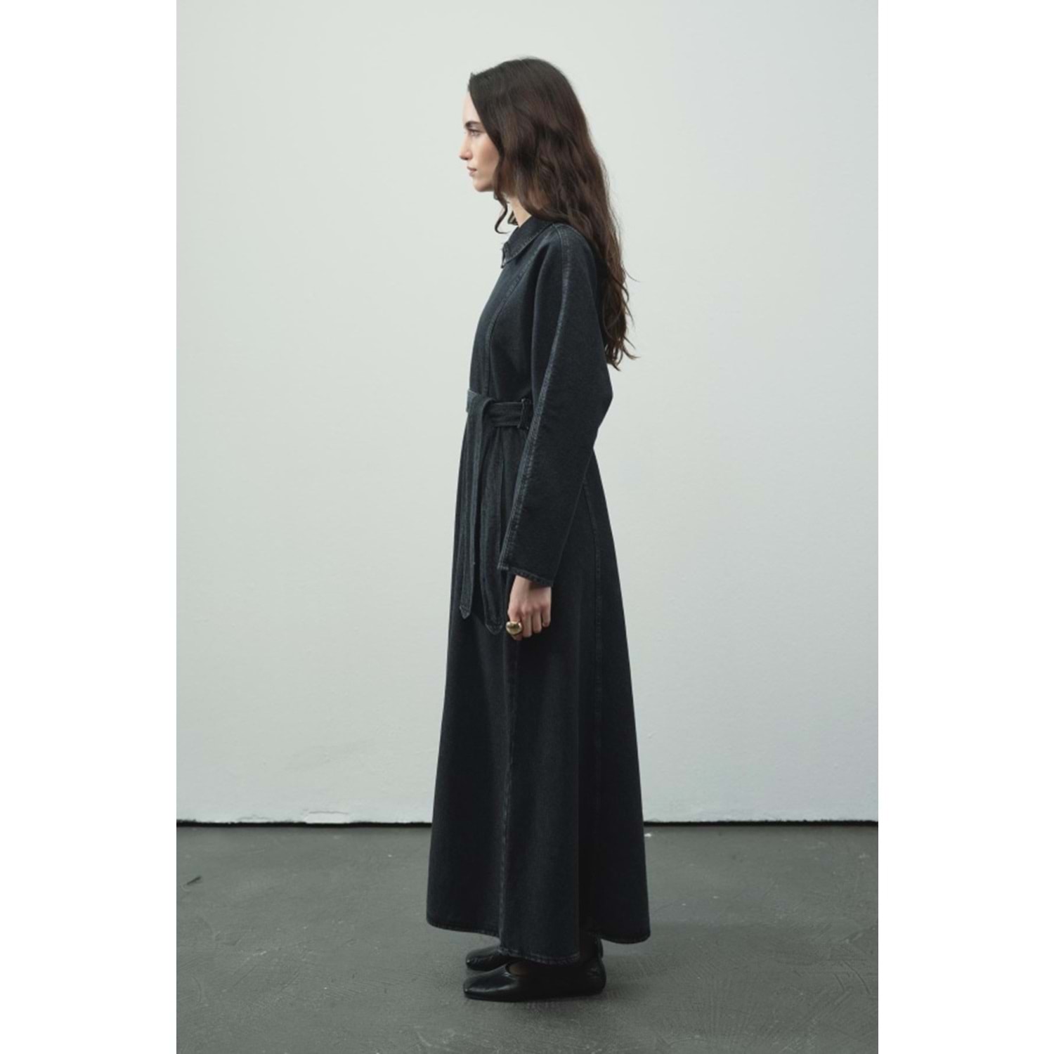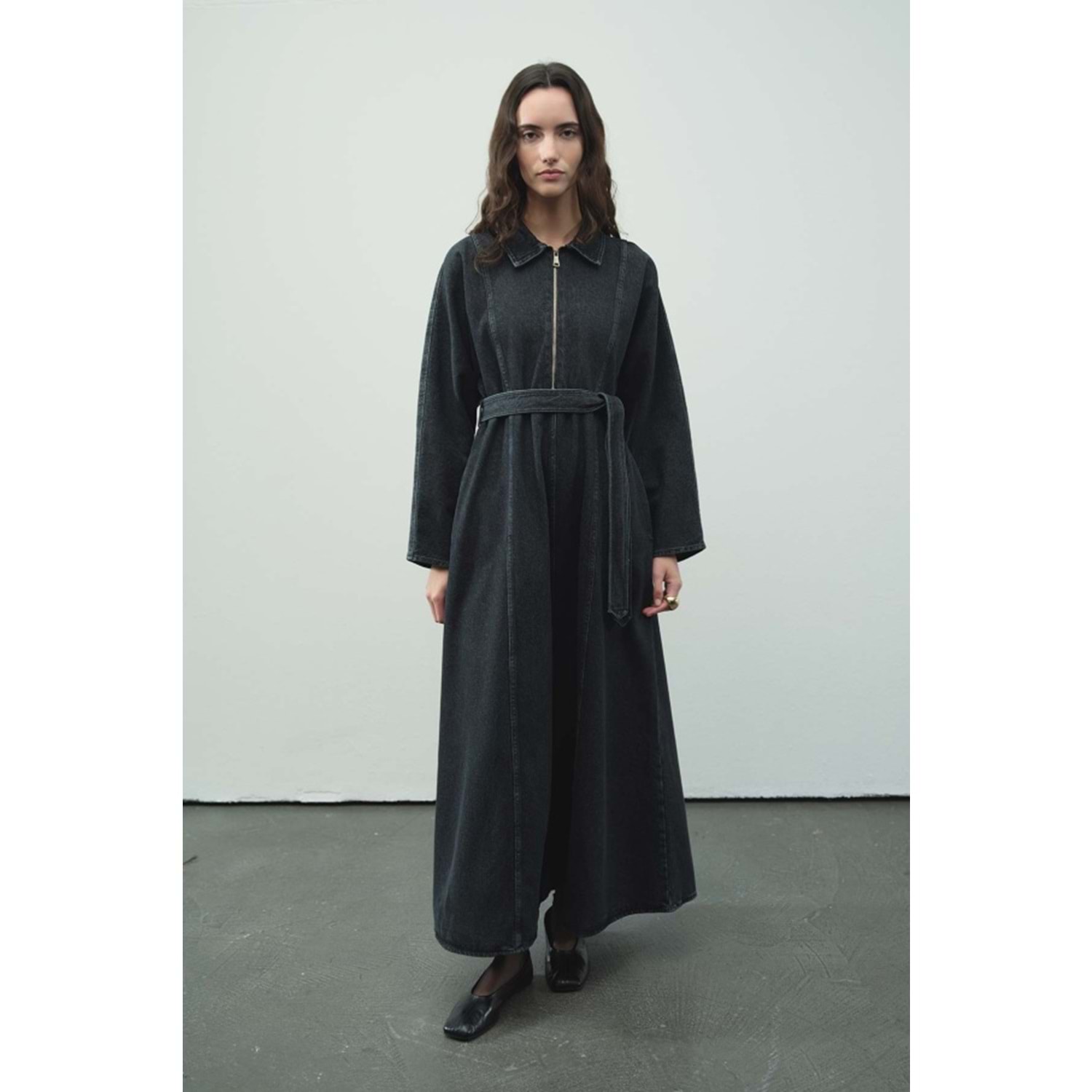 büyük beden antrasit elbise, L XL denim elbise, uzun siyah kot elbise, fermuarlı uzun elbise, koyu renk büyük beden elbise, kuşaklı kot elbise, büyük beden maxi elbise, pamuklu L XL elbise