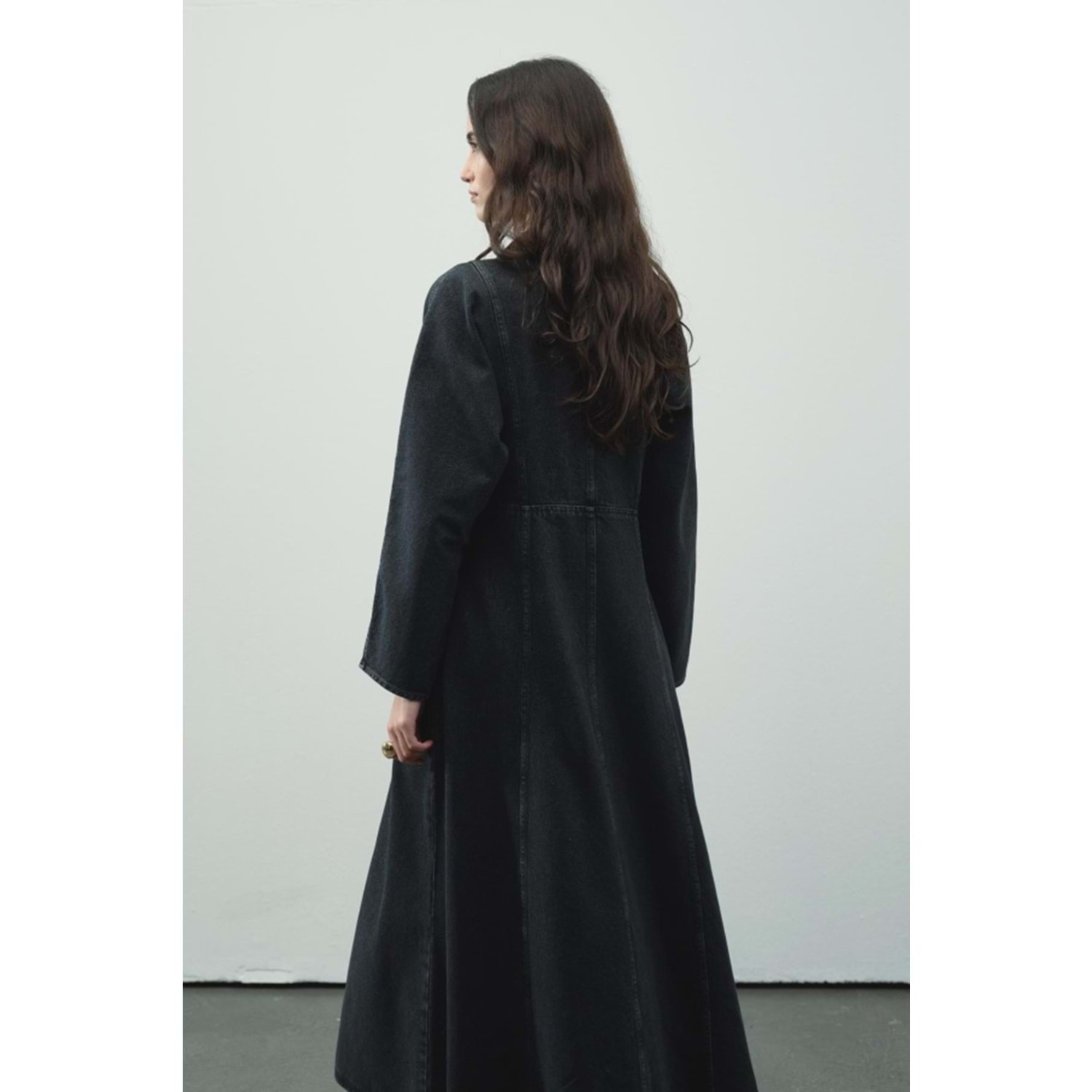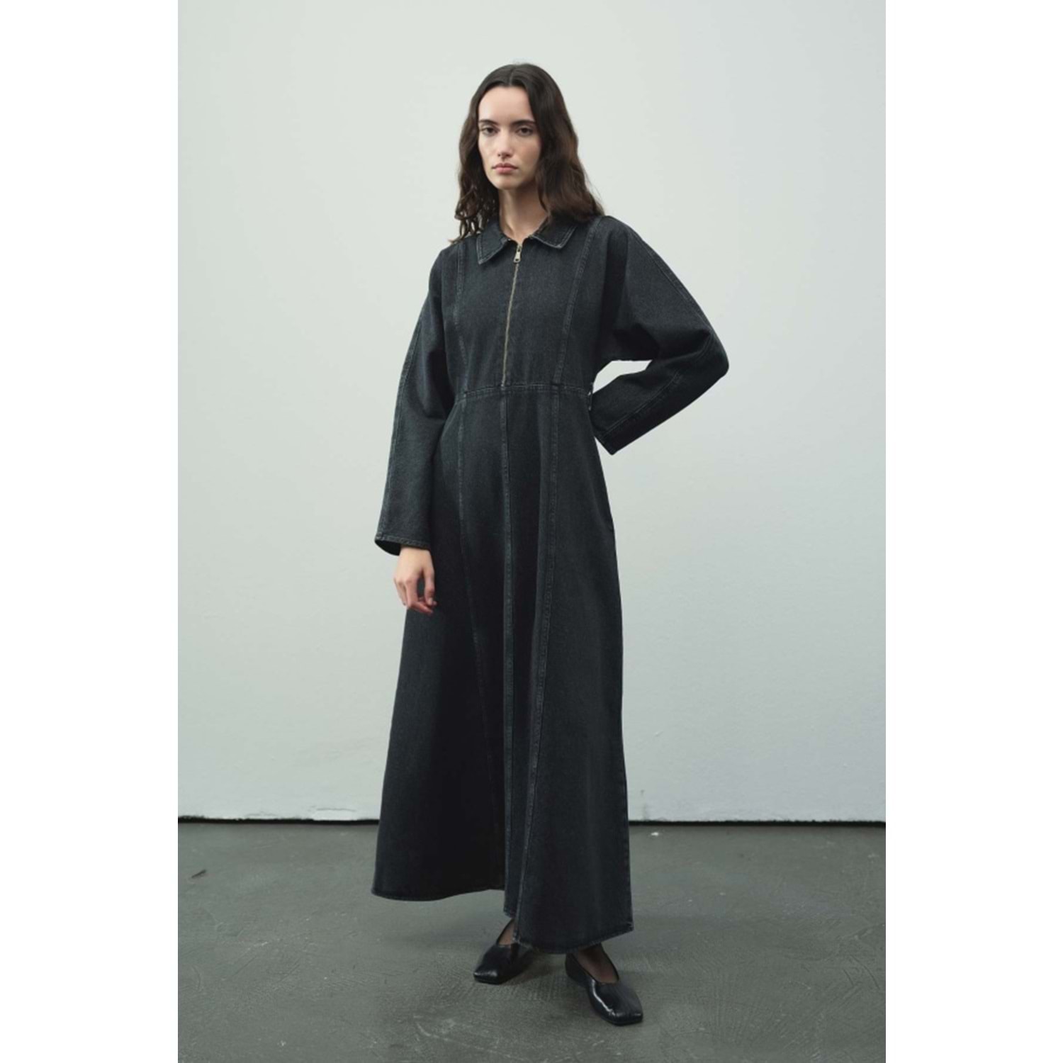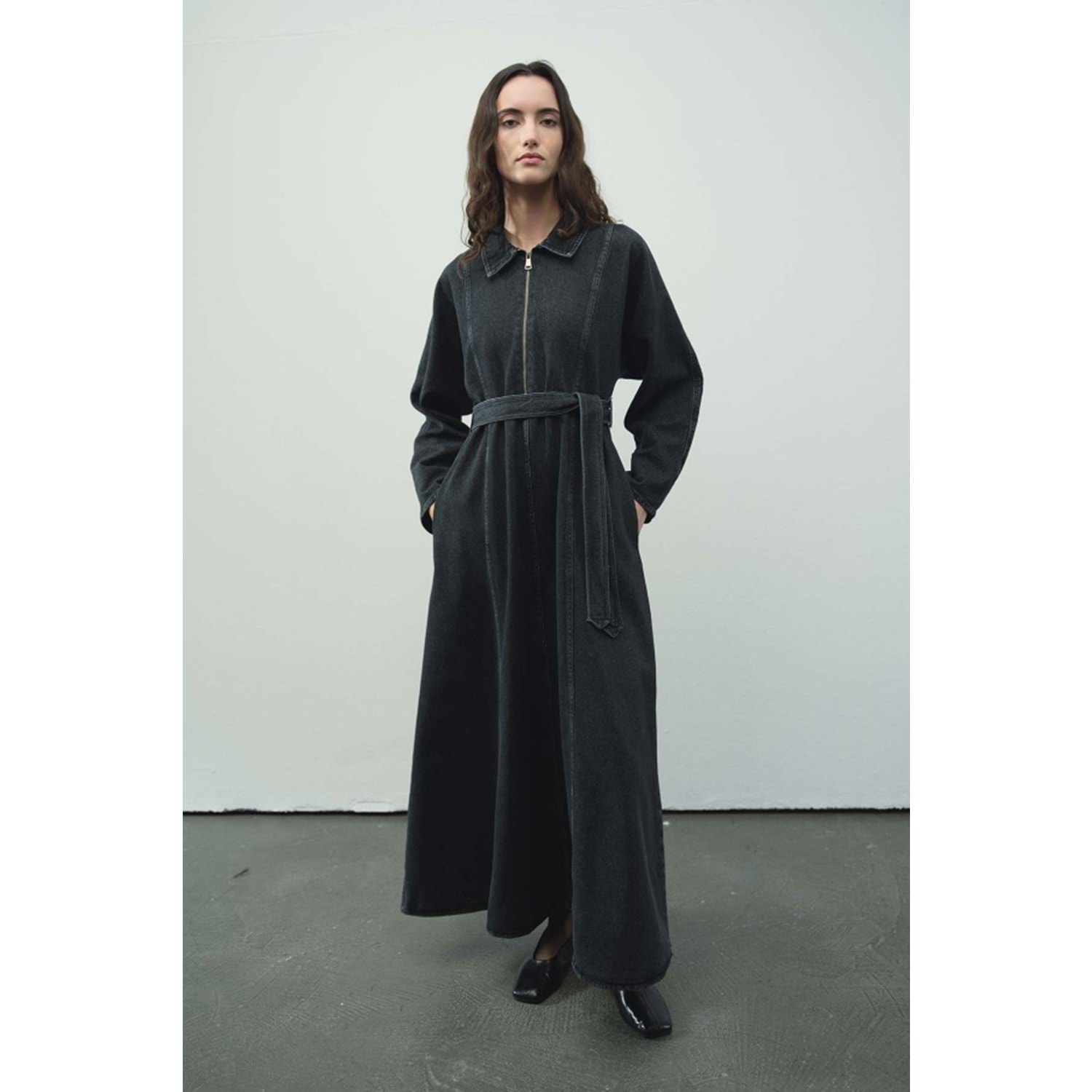 antrasit denim elbise, siyah kot elbise, uzun siyah elbise, fermuarlı antrasit elbise, koyu renk denim elbise, gömlek yaka elbise, kuşaklı uzun elbise, mevsimlik denim elbise, maxi boy siyah elbise