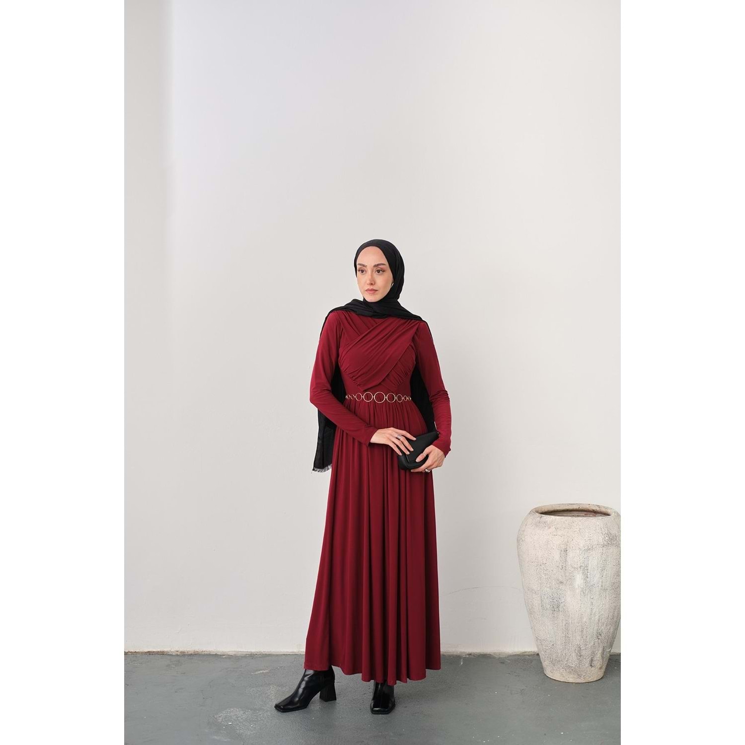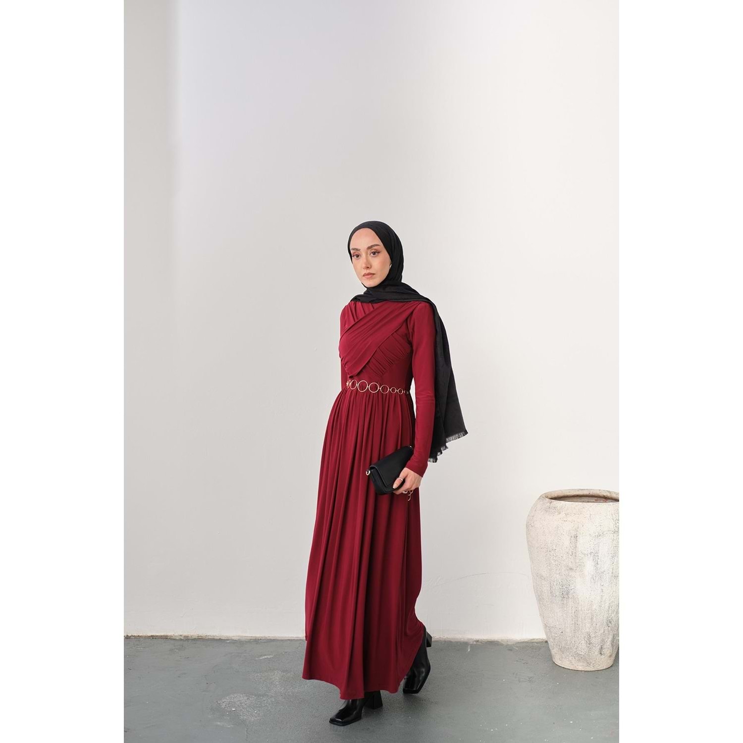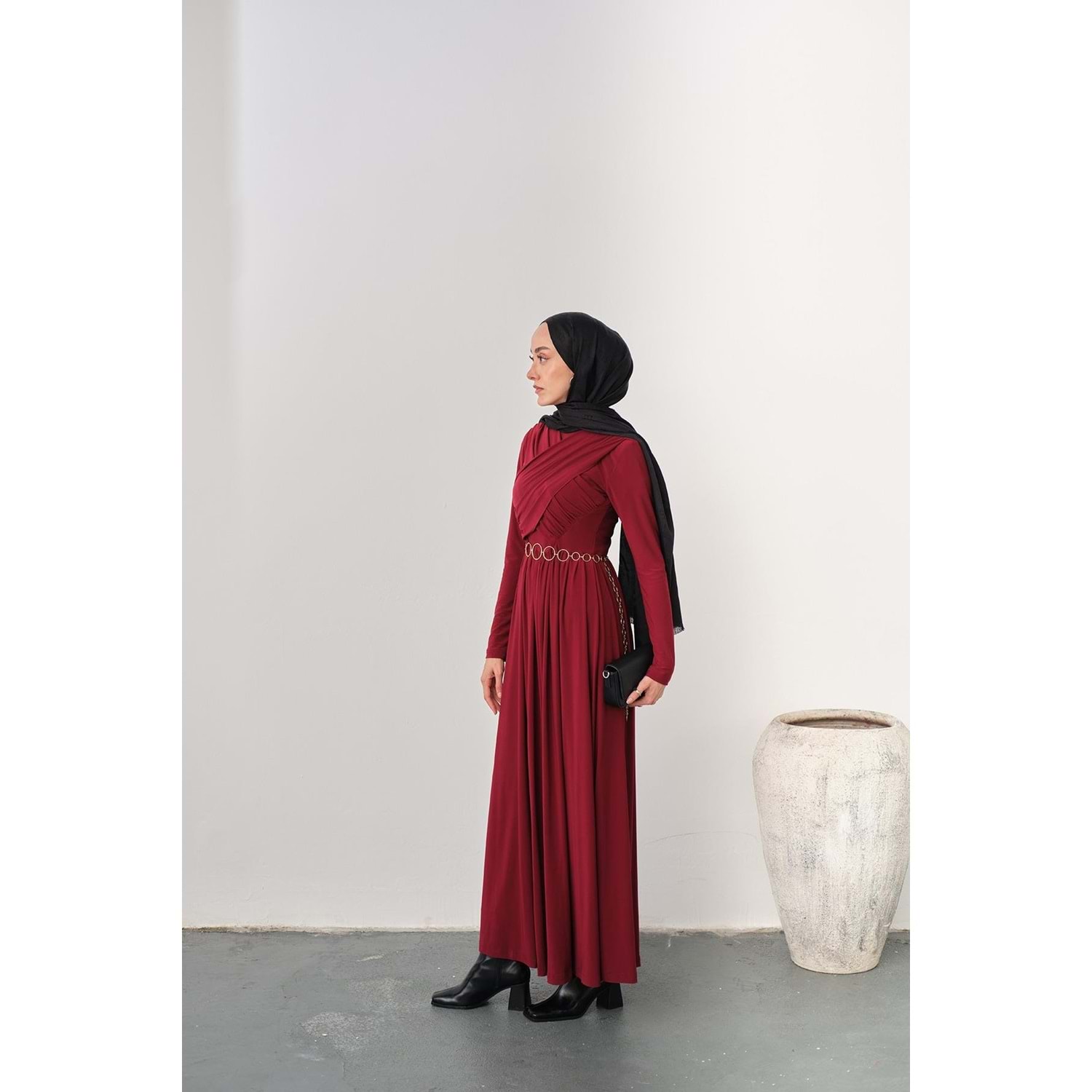 Bu zarif ve şık bordo elbise, S-M (36-38) beden için özel olarak hazırlanmıştır. Gold Zincir Kemer aksesuarı ve göğüs bölgesindeki estetik pile detaylarıyla hem günlük hem de özel davetlerinizde göz kamaştırın.