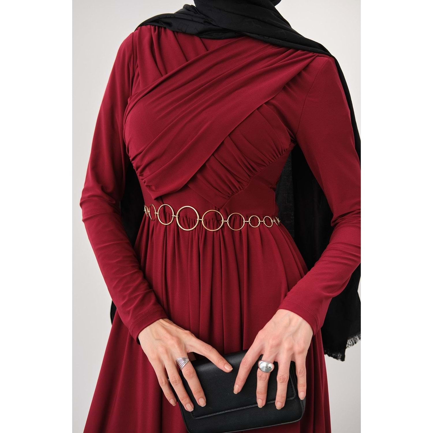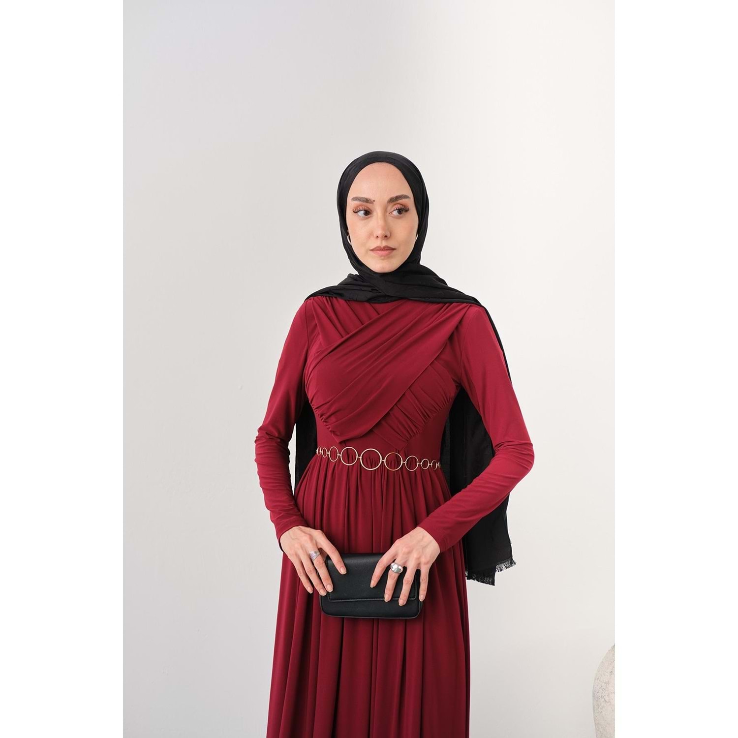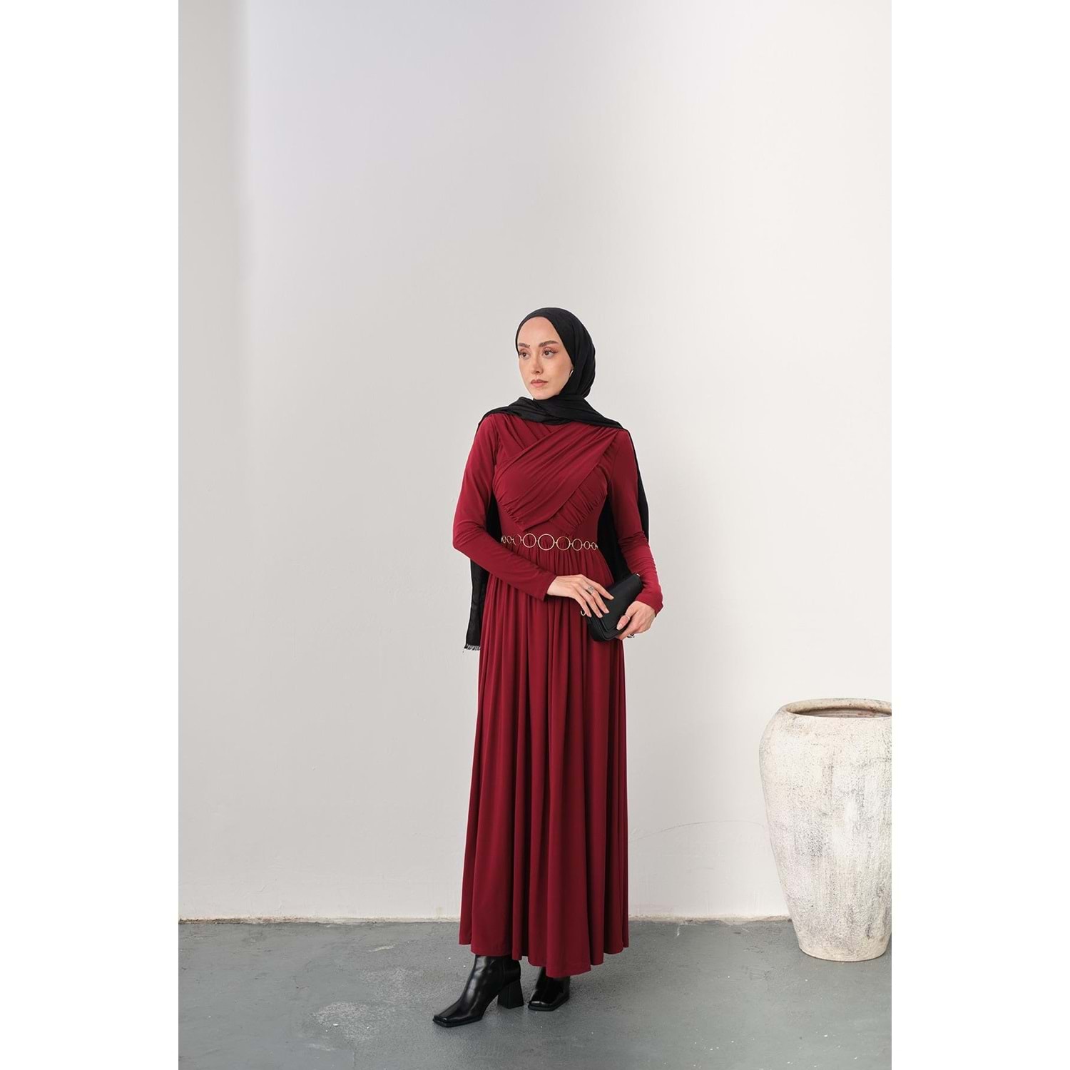 Bu zarif ve şık bordo elbise, S-M (36-38) beden için özel olarak hazırlanmıştır. Gold Zincir Kemer aksesuarı ve göğüs bölgesindeki estetik pile detaylarıyla hem günlük hem de özel davetlerinizde göz kamaştırın.