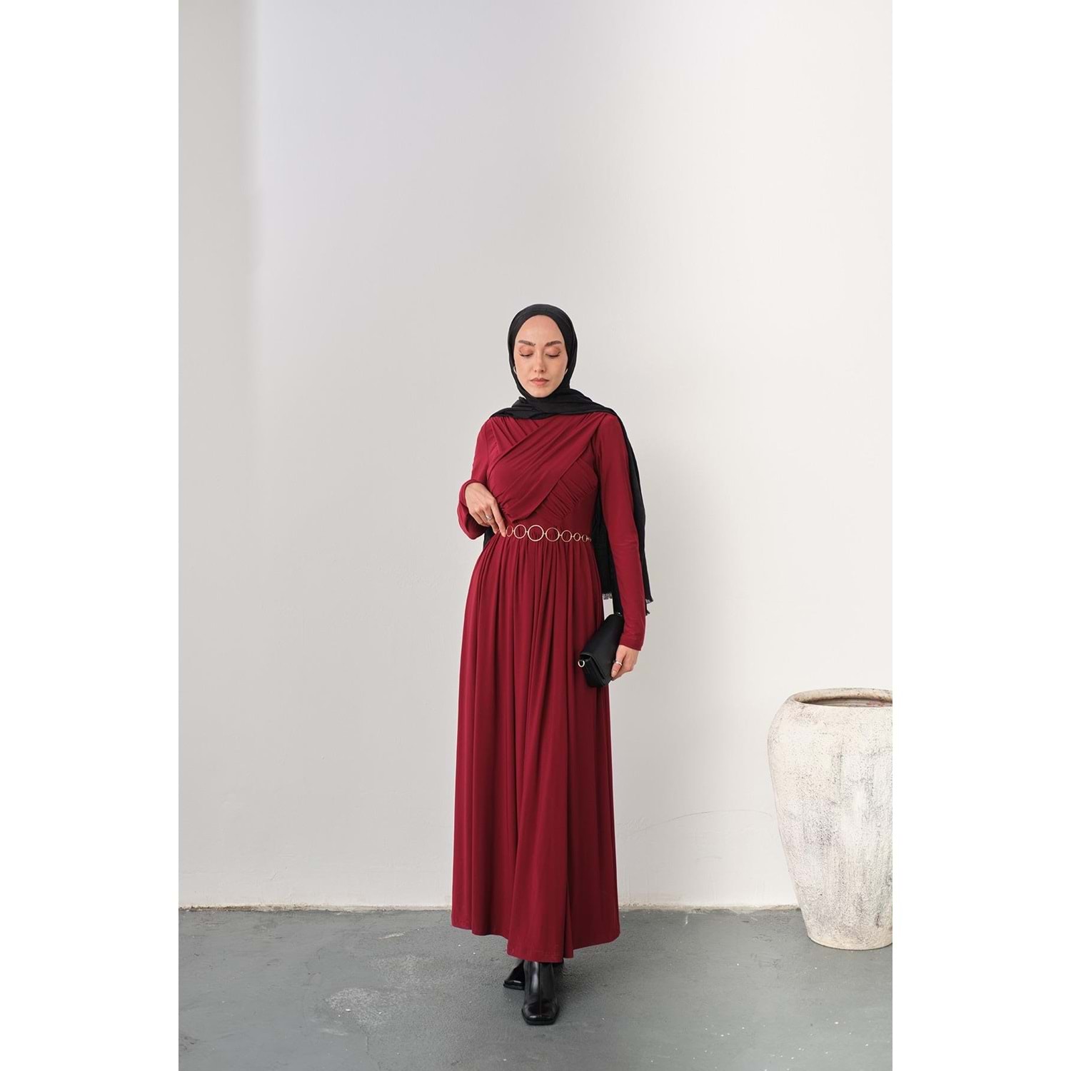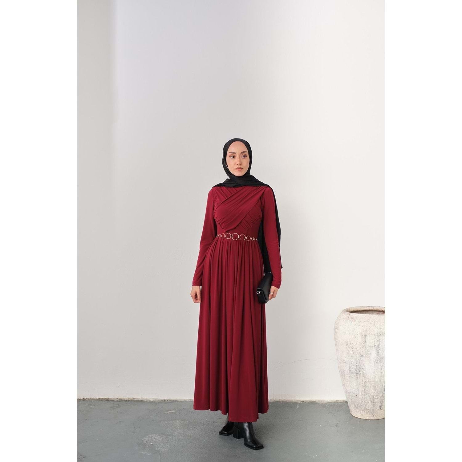 40-42 beden bordo elbise, gold kemerli L-XL, büyük beden bordo elbise, tesettür abiye L-XL, uzun kollu elbise 40-42, Sandy kumaş L-XL, pile detaylı büyük beden elbise