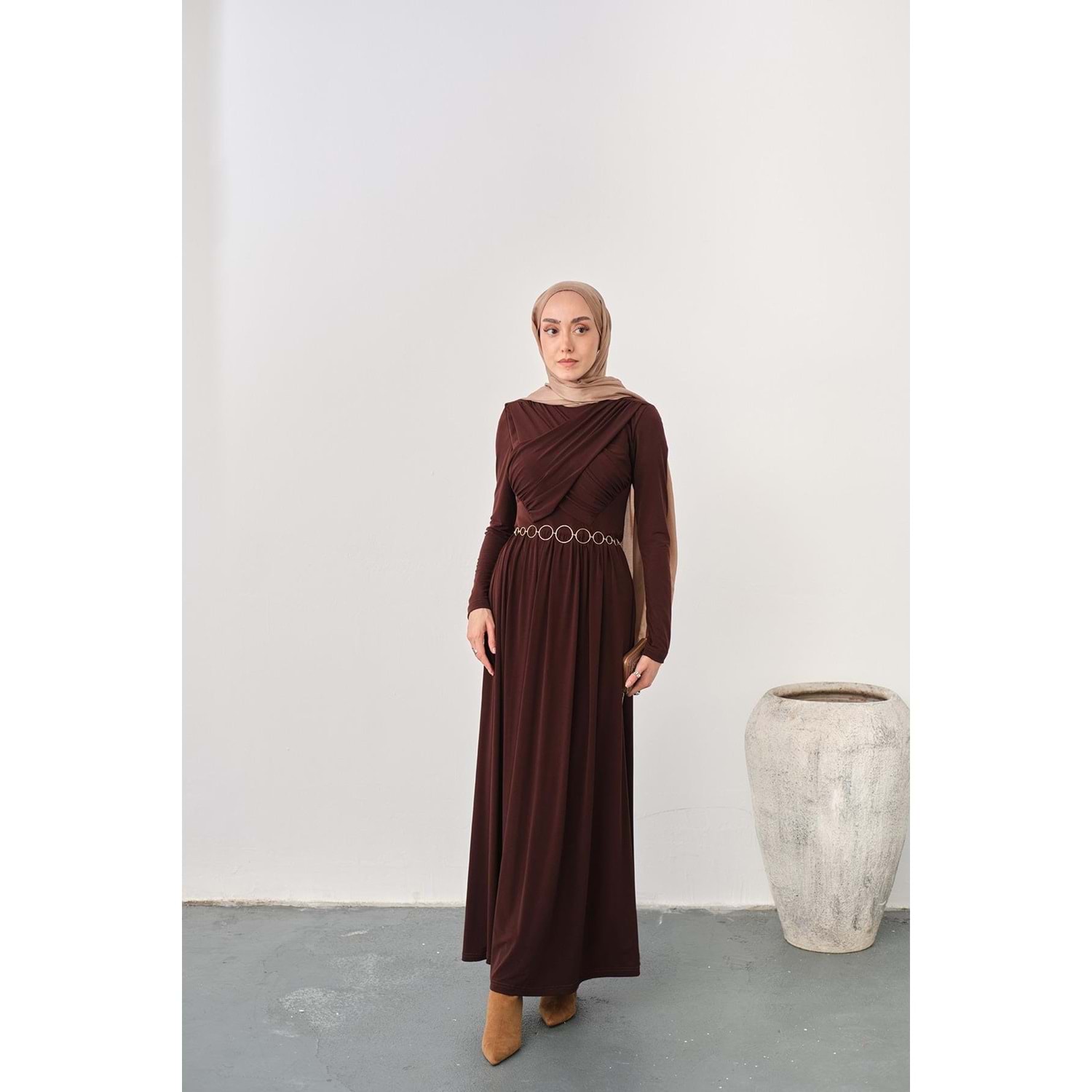 40-42 beden kahverengi elbise, gold kemerli L-XL, büyük beden kahverengi elbise, tesettür abiye L-XL, uzun kollu elbise 40-42, Sandy kumaş L-XL, pile detaylı büyük beden elbise, 140 cm elbise 40-42