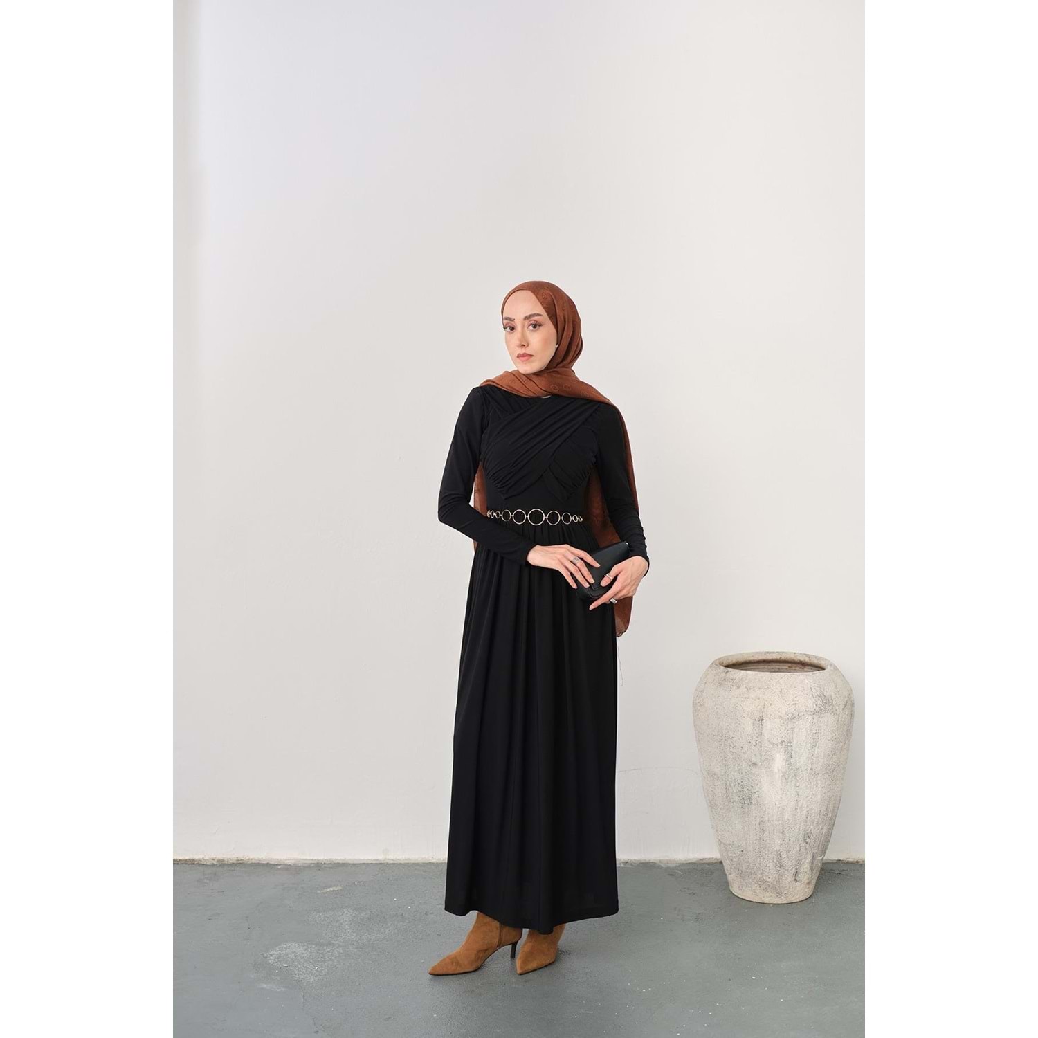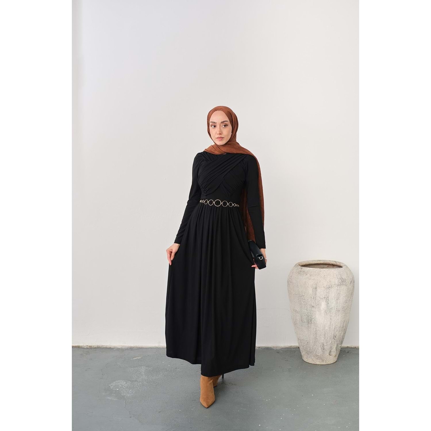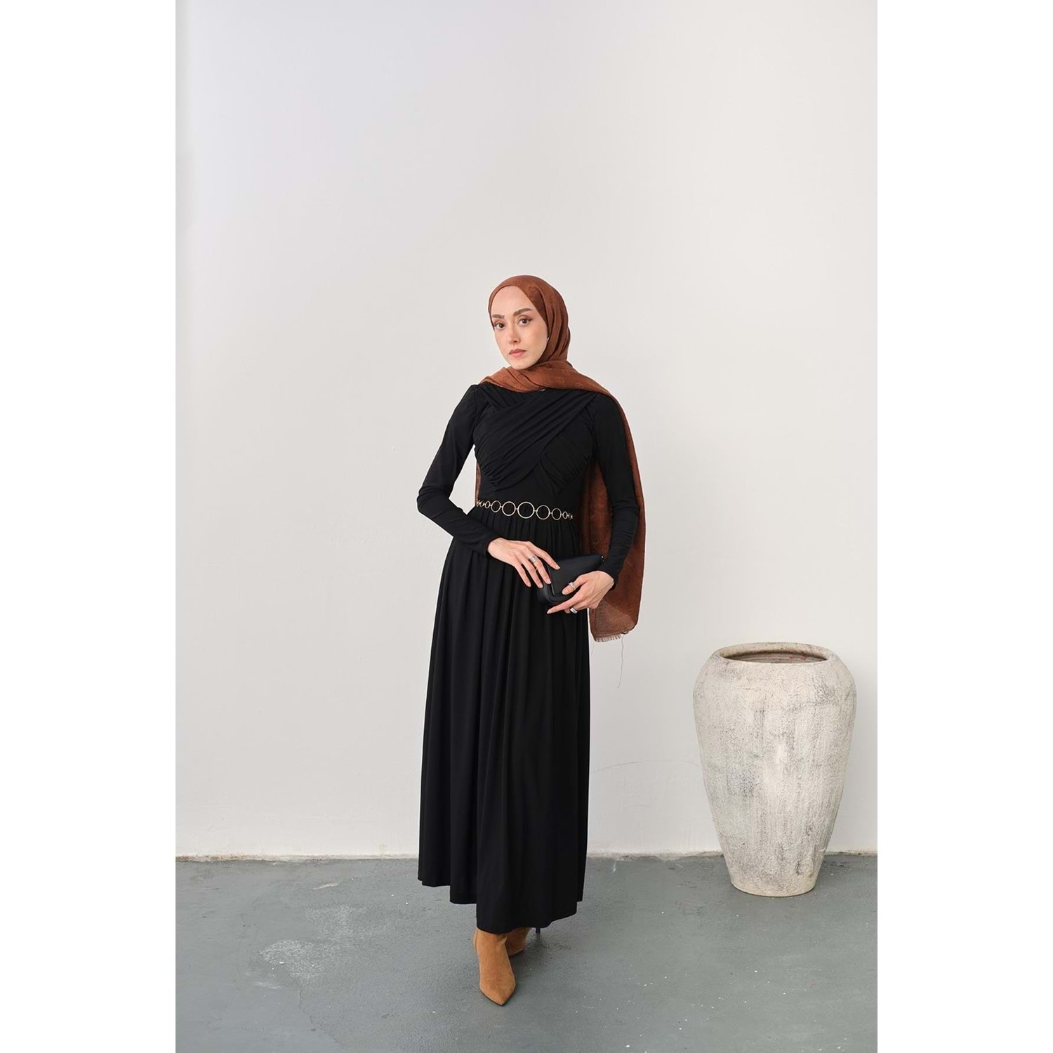 Her gardırobun olmazsa olmazı olan bu şık siyah elbise, S-M (36-38) beden için özel olarak tasarlanmıştır. Zamansız siyah rengi, Gold Zincir Kemer ve göğüs bölgesindeki zarif pile detayları ile asil ve modern bir görünüm sunar.