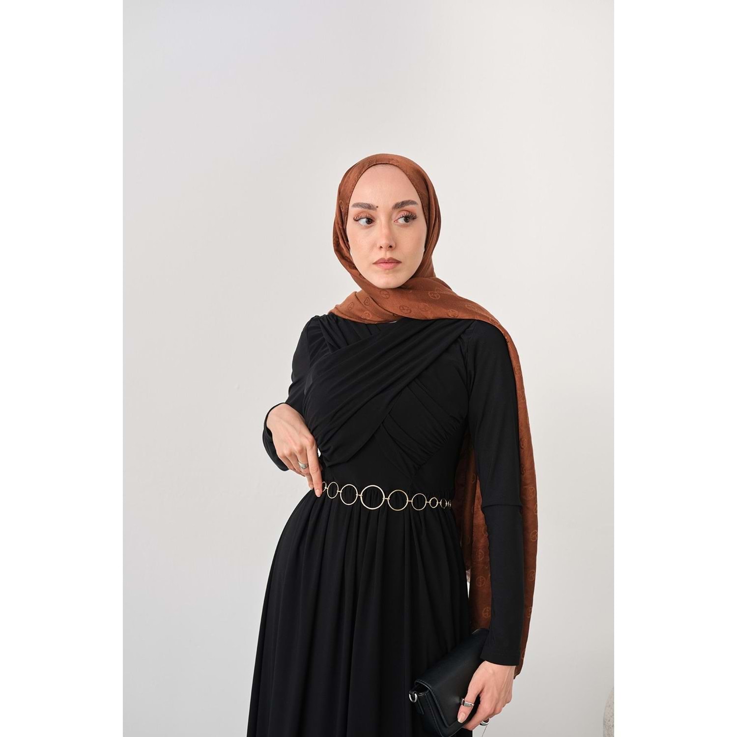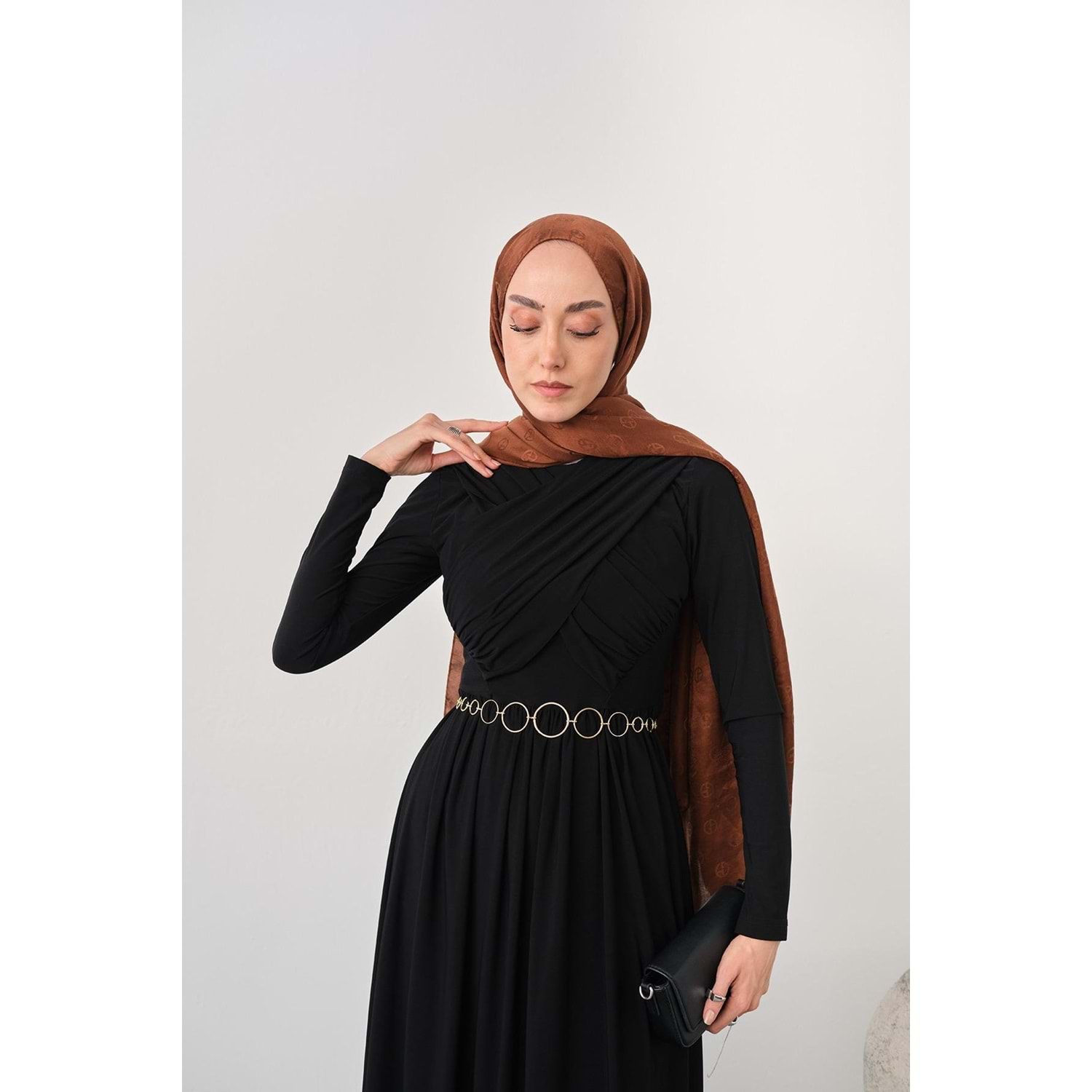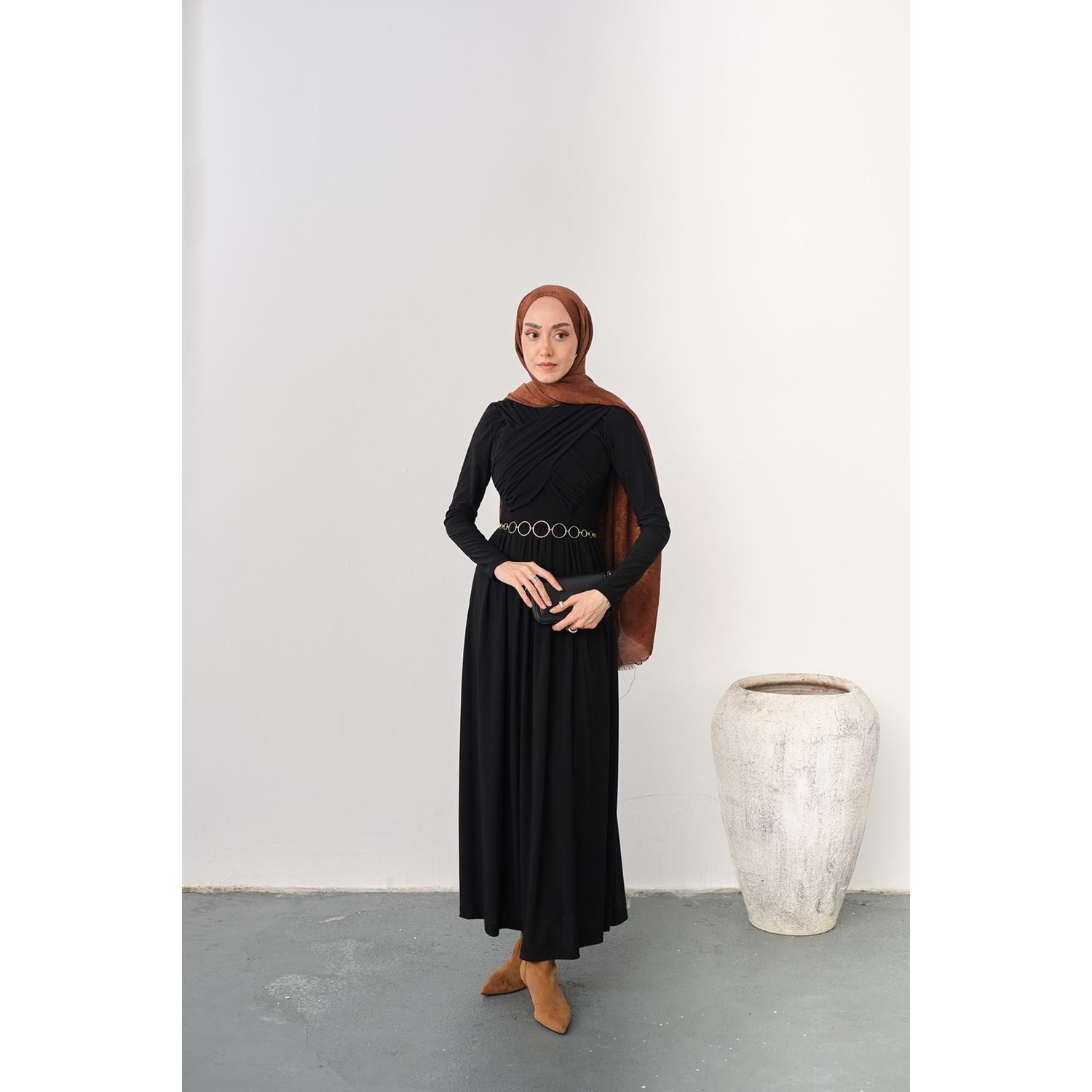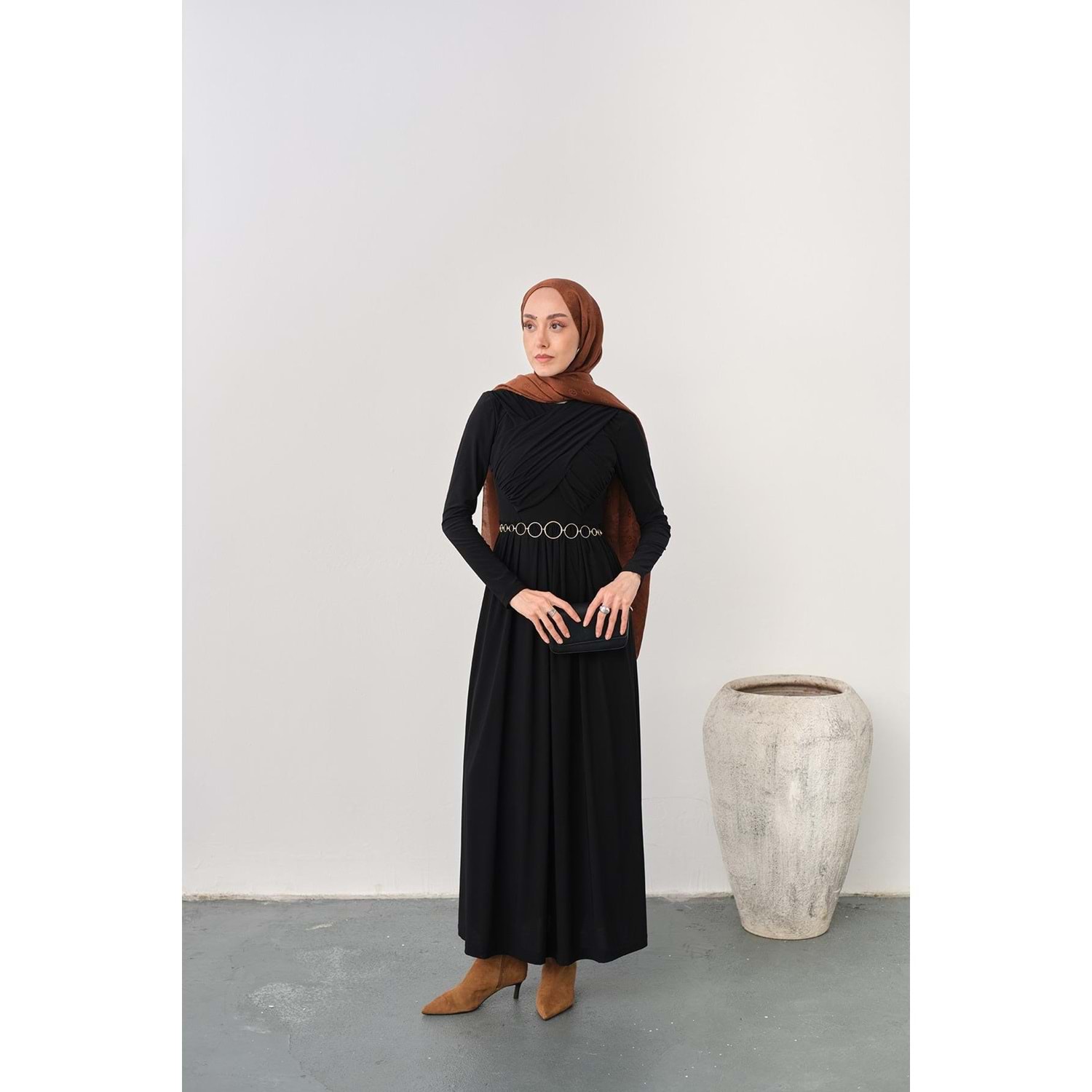 Her gardırobun olmazsa olmazı olan bu şık siyah elbise, S-M (36-38) beden için özel olarak tasarlanmıştır. Zamansız siyah rengi, Gold Zincir Kemer ve göğüs bölgesindeki zarif pile detayları ile asil ve modern bir görünüm sunar.