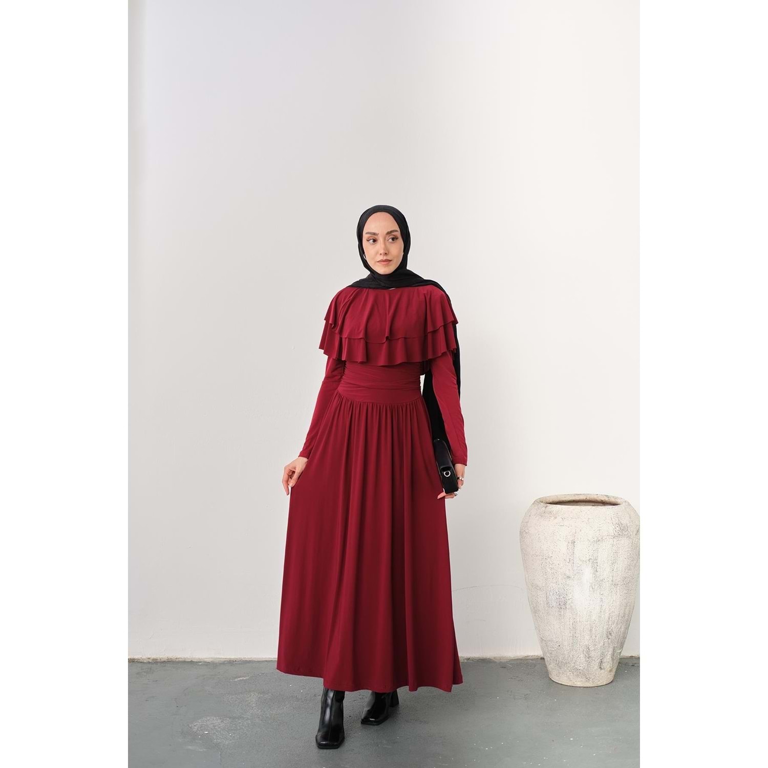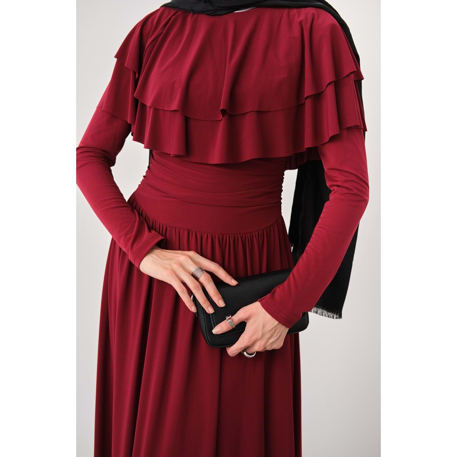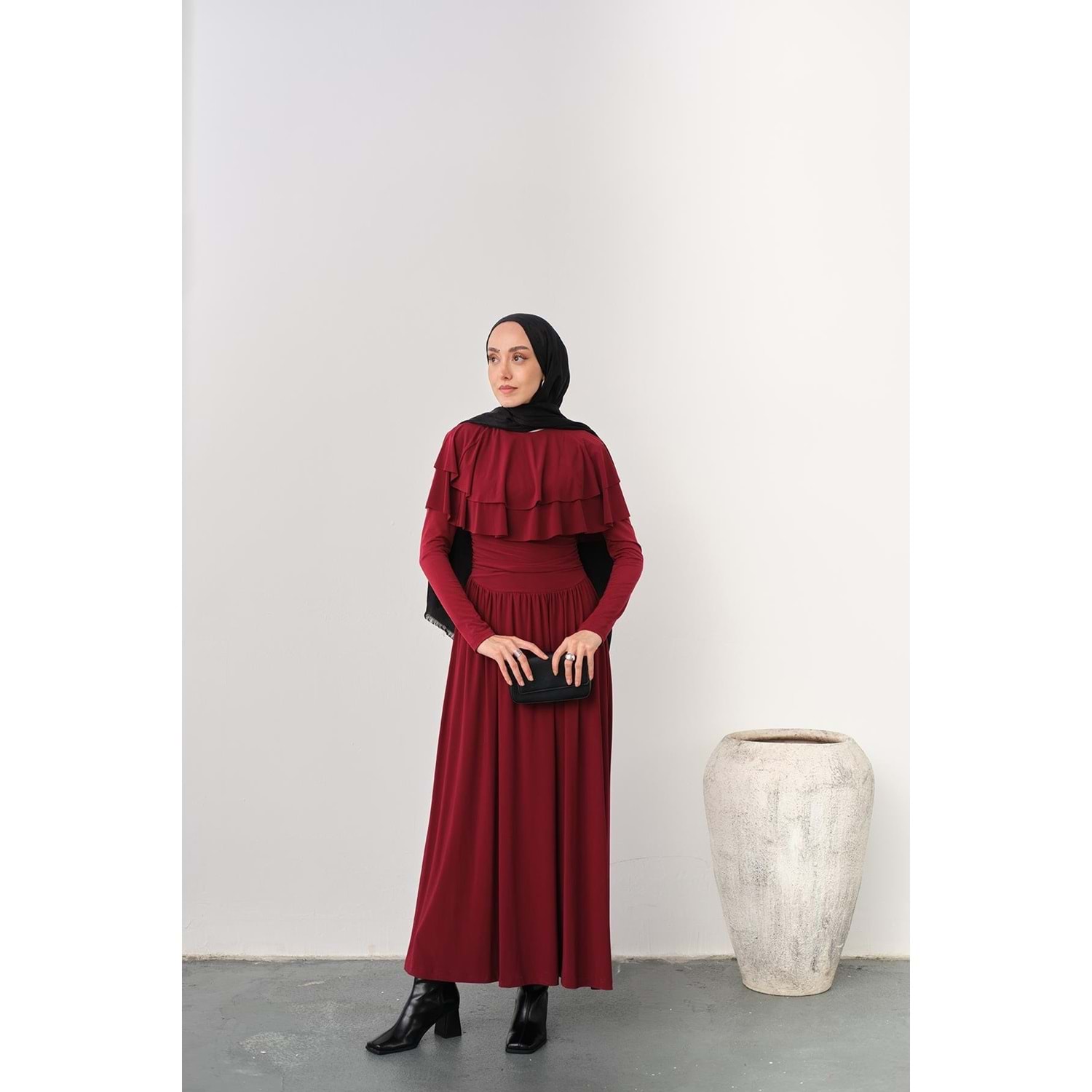 Bu zarif Omuz Fırfır Detaylı Bordo Elbise, özellikle davet ve özel günleriniz için ideal bir seçimdir. S-M (36-38) beden için tasarlanmıştır. Akıcı ve rahat Sandy kumaşı, elbisenin dökümünü artırırken, omuzlardaki katlı fırfır detayı romantik bir hava katmaktadır.