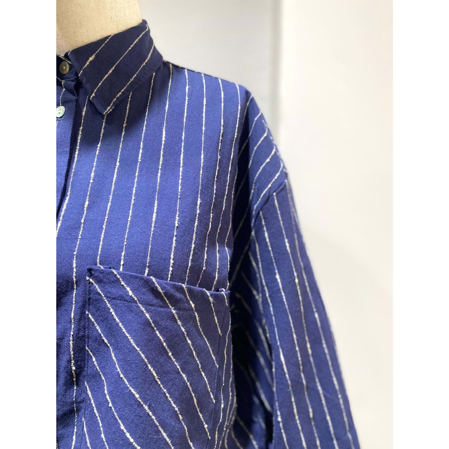 Çizgili Crop Keten Lacivert Standart Gömlek