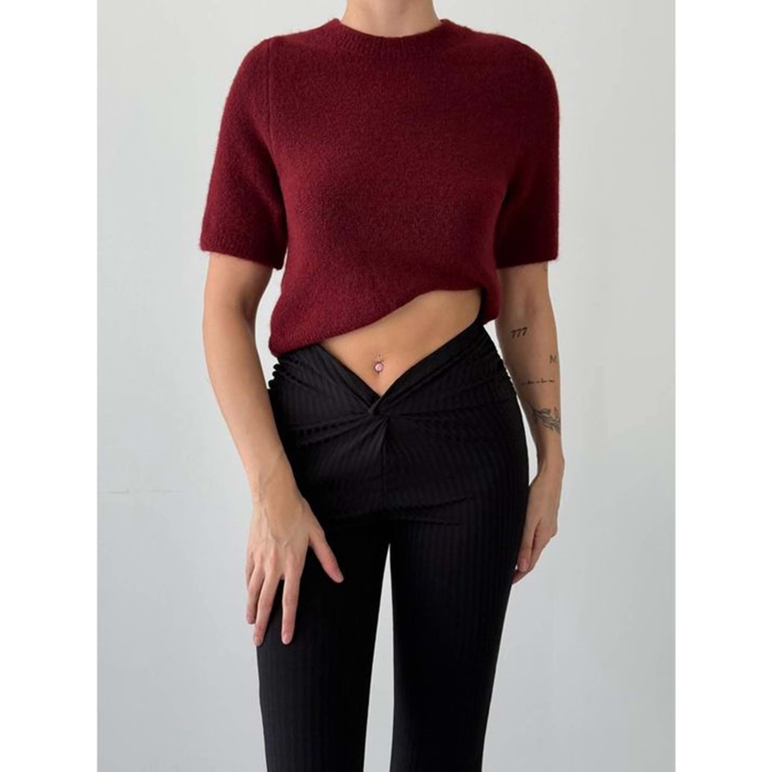 bordo crop kazak, kısa kollu kazak, akrilik polyester kazak, örgü kazak, kadın kazak, kışlık crop, vizon kazak