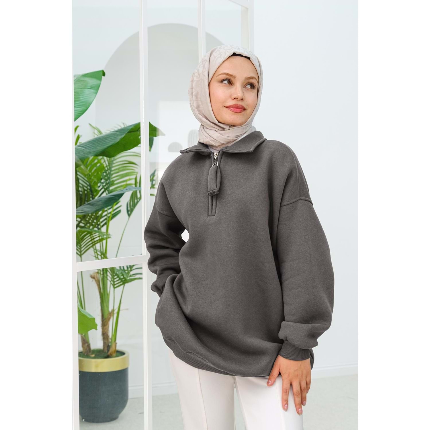 füme sweatshirt, kadın oversize sweat, yarım fermuarlı sweatshirt, şardonlu kalın sweat, üç iplik sweatshirt, uzun kesim kadın sweat, 36 beden sweatshirt, 38 beden sweat, 40 beden sweat, kışlık kadın sweat, pamuklu sweat