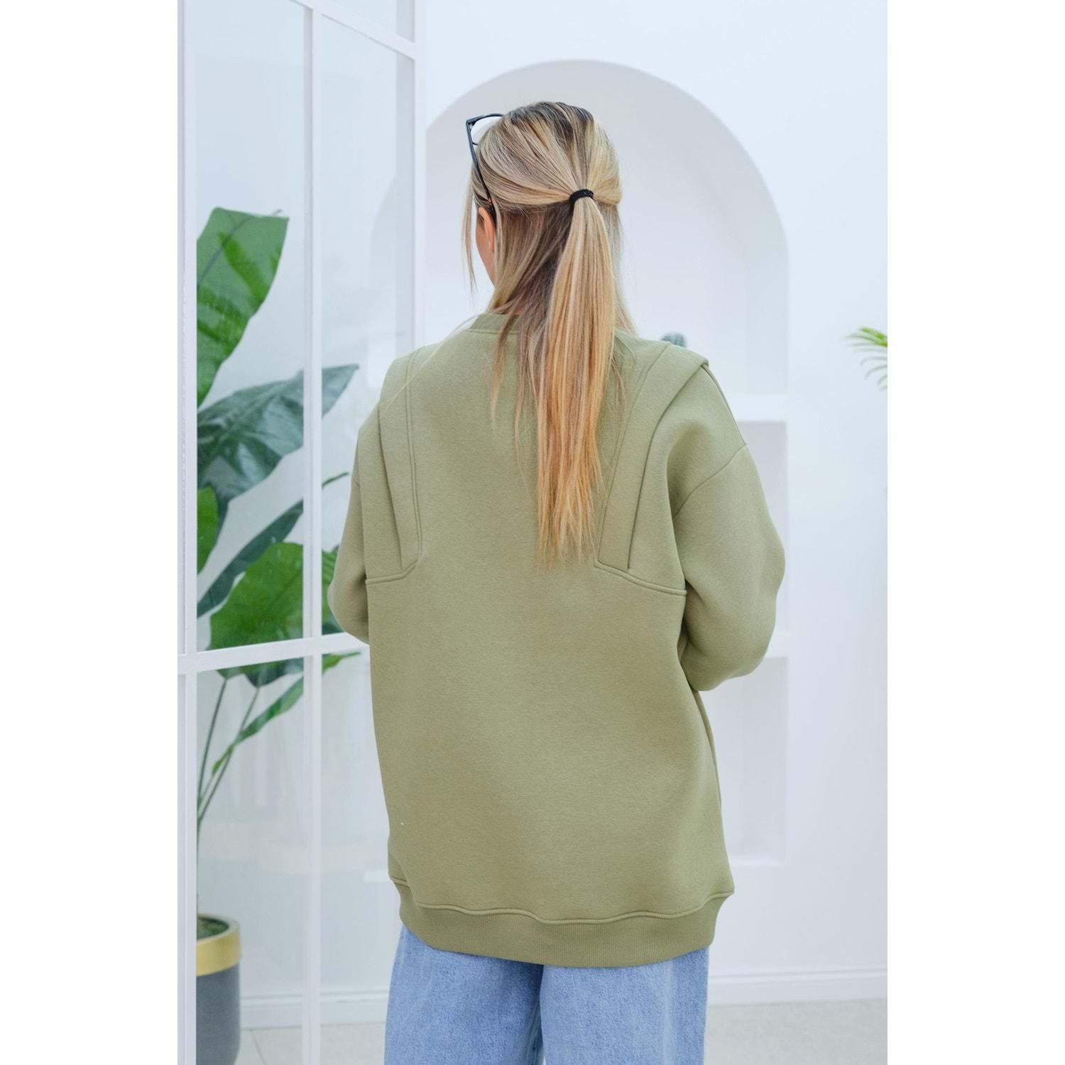 Çift Omuz Detaylı Polarlı Yeşil Kadın Sweat (40, 42, 44 Beden)
