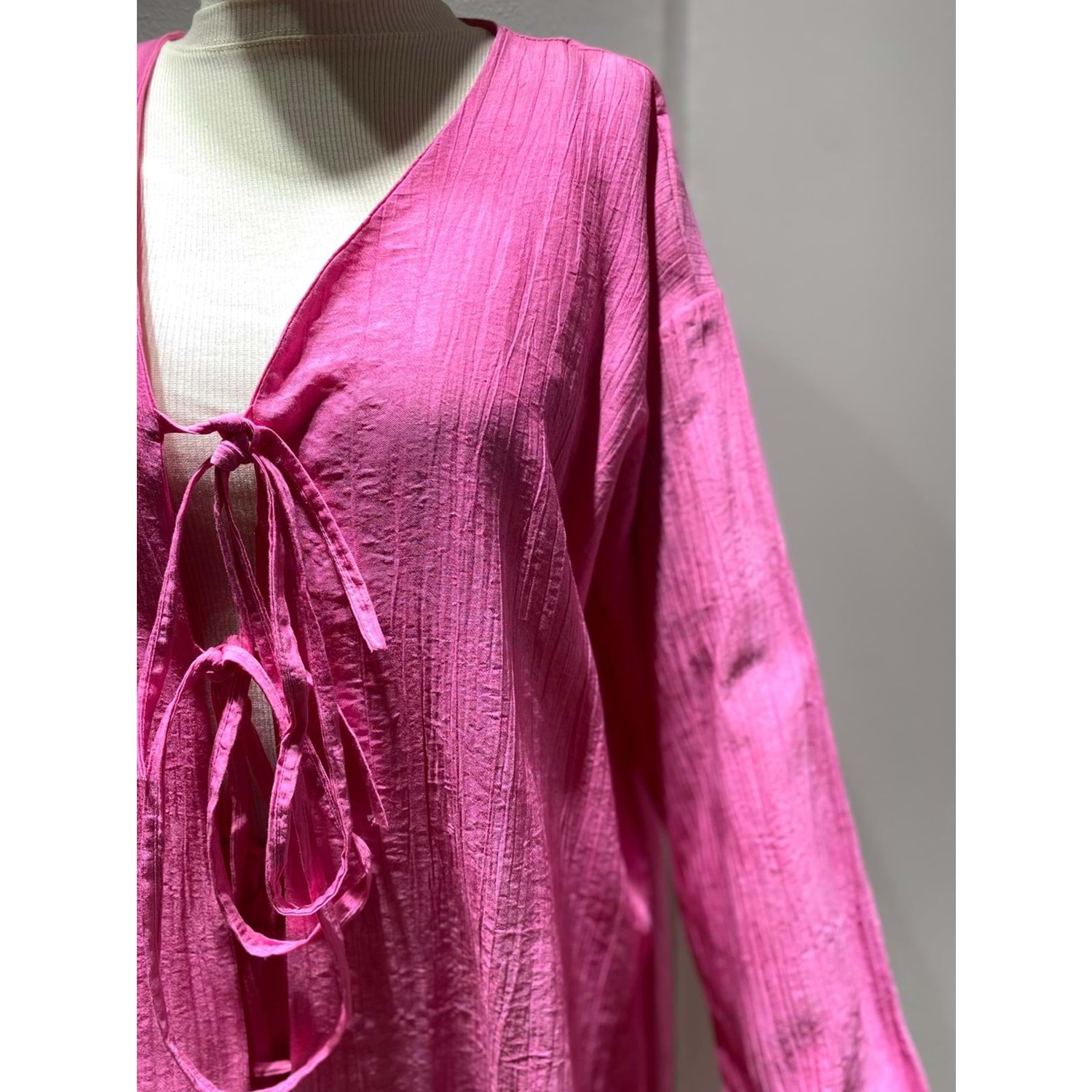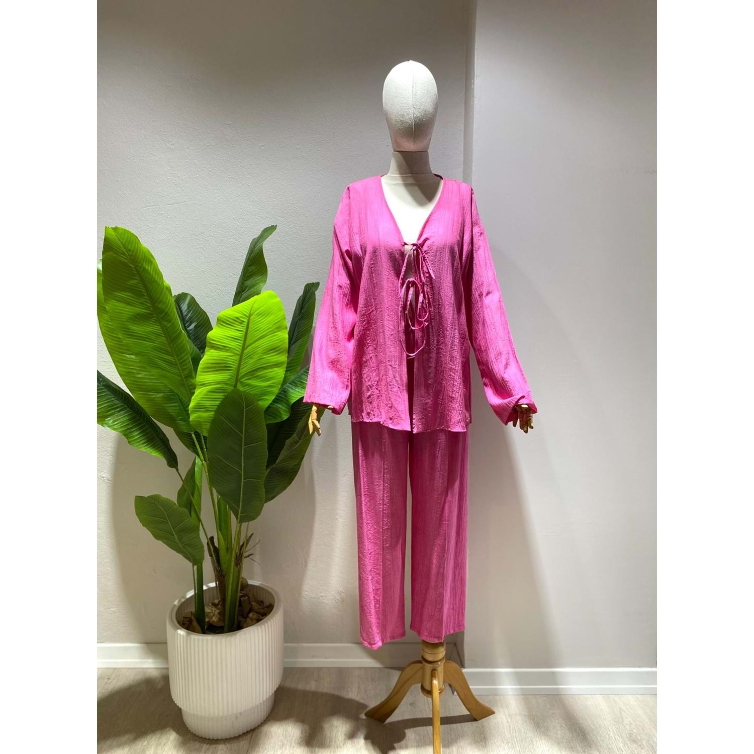 Şıklığı ve rahatlığı bir arada sunan bu takım, özel dokusu ve modern kesimiyle gün boyu tarzınızı yansıtmanıza yardımcı olur. Hafif ve nefes alan çilek kumaşı sayesinde yaz aylarında konforlu kullanım sağlar. İki bağlamalı kimono tasarımı, vücudu zarifçe sararken, bol kesim pantolon ise hareket özgürlüğü sunar. İster günlük kombinlerde ister tatilde, ister ev şıklığında tercih edebileceğiniz çok yönlü bir takımdır.
