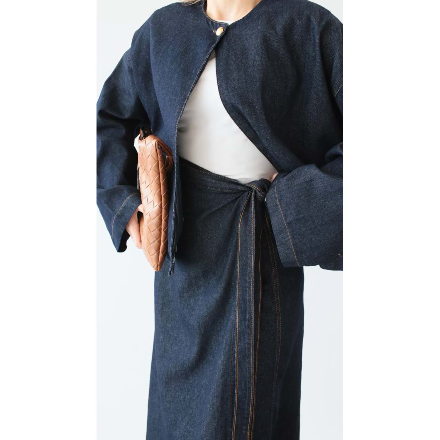 %100 pamuklu, yüksek kaliteli denim kumaştan üretilen bu ikili takım, gardırobunuzun en joker parçası olmaya aday. Sıradan jean takımların aksine, oversize ceket ve bağlamalı etek kombiniyle hem konforlu hem de iddialı bir silüet yaratır.
