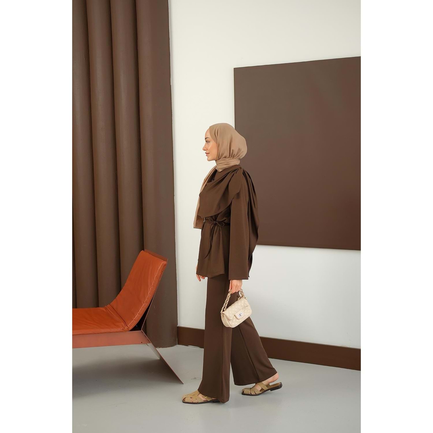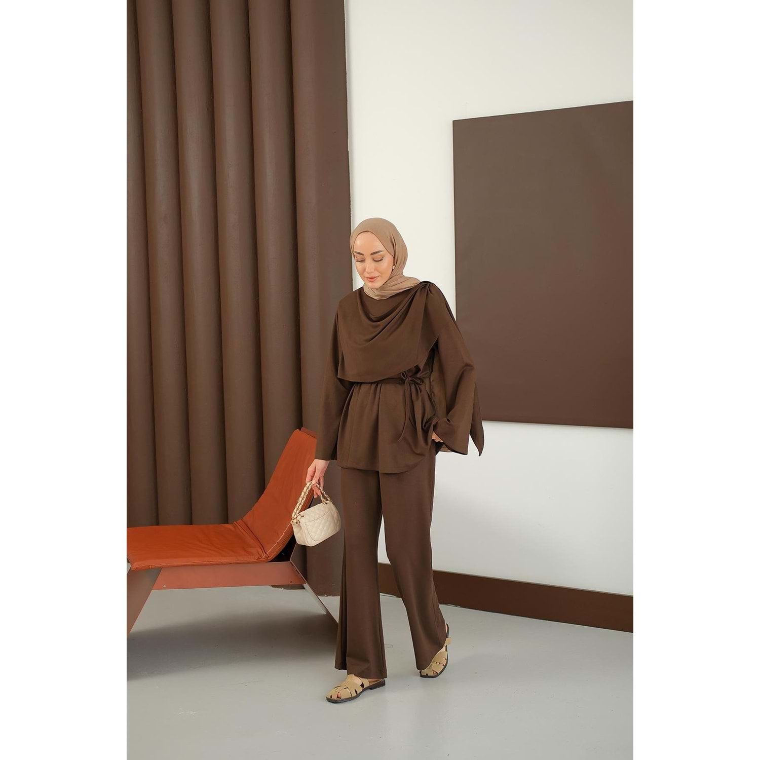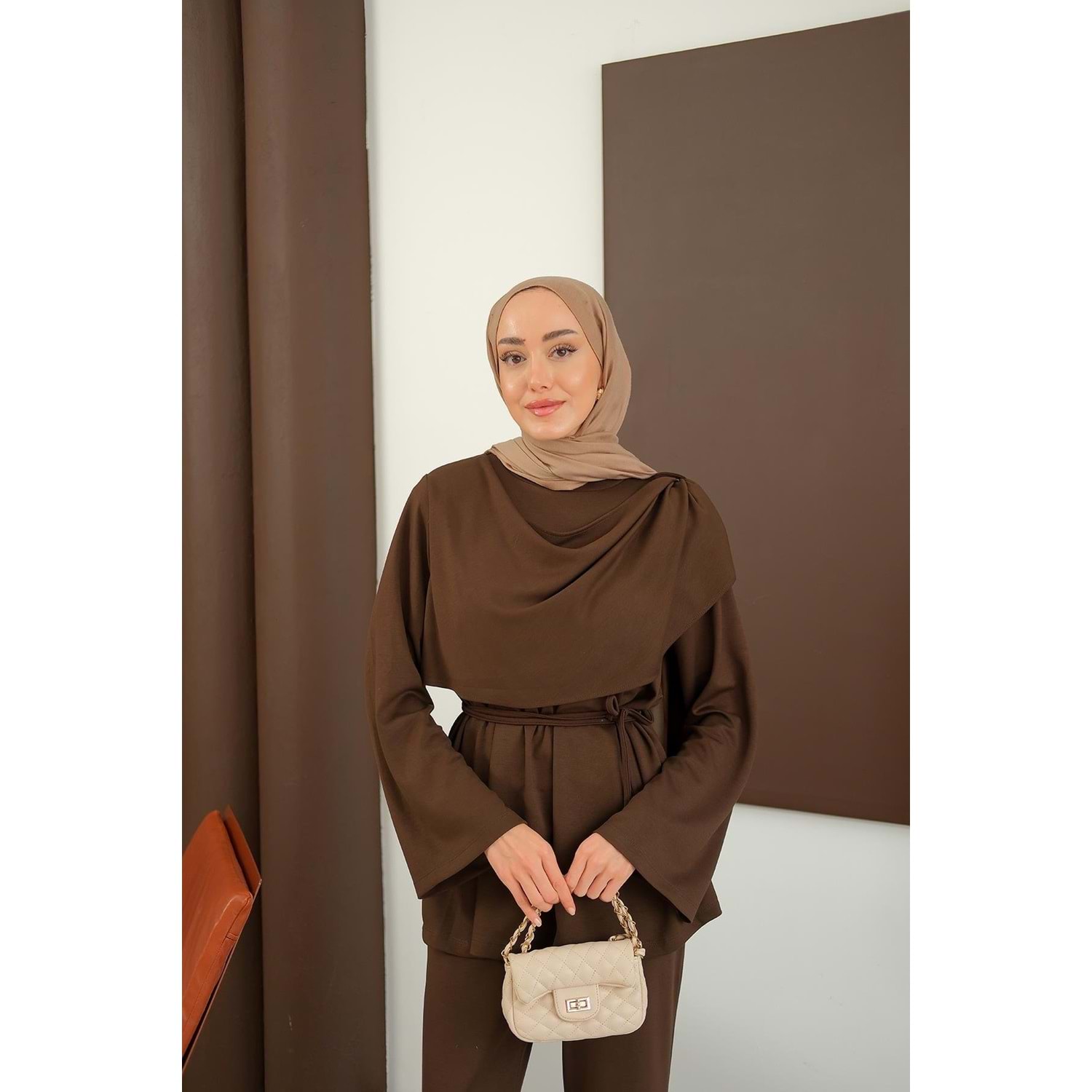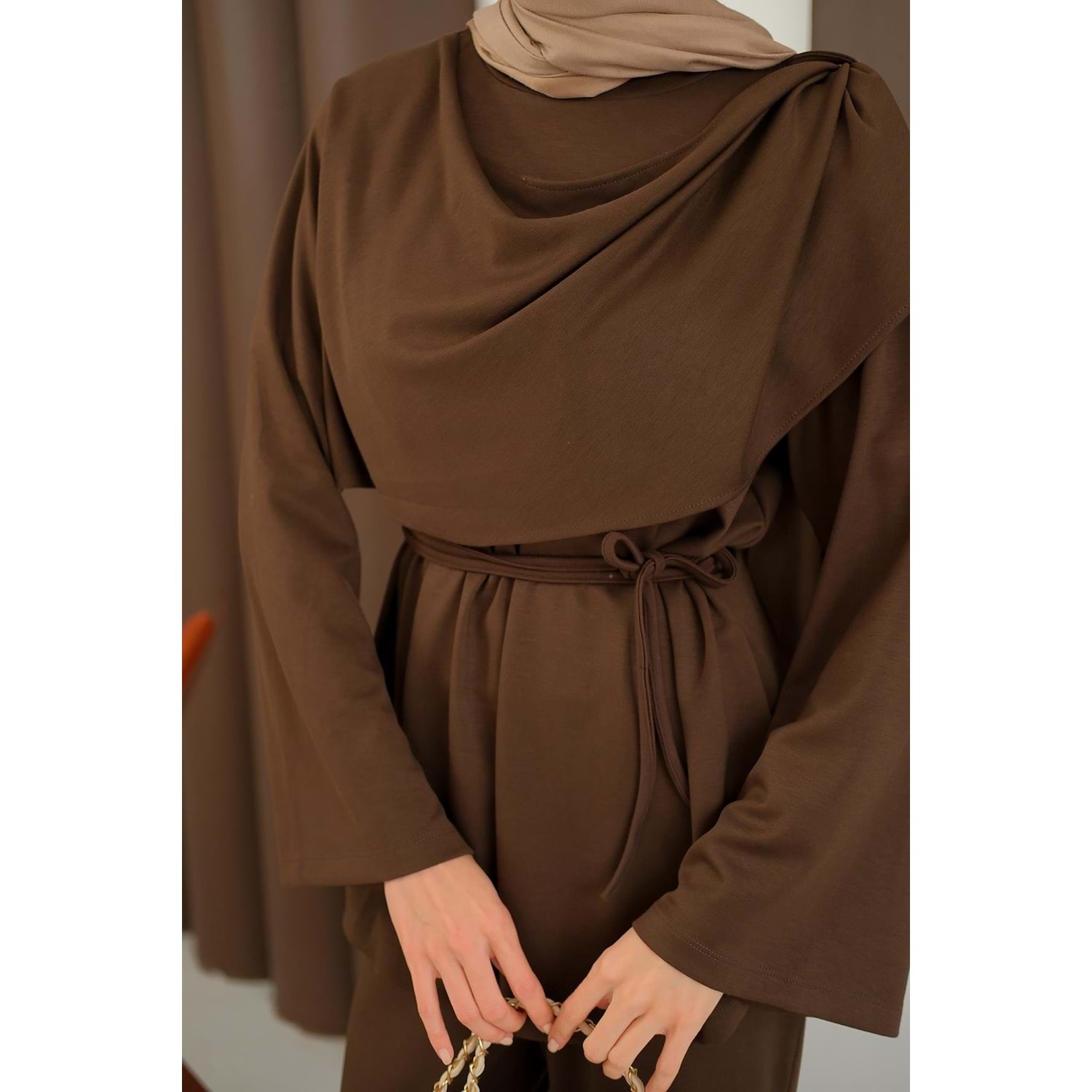 36-38 beden kahverengi takım, s-m tesettür ikili set, kahve şal detaylı kombin, 36 beden şık takım, 38 beden kahverengi tesettür