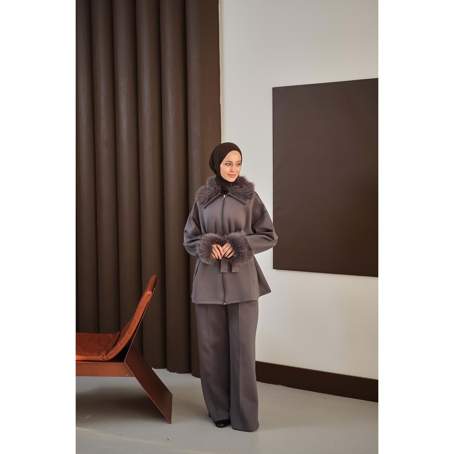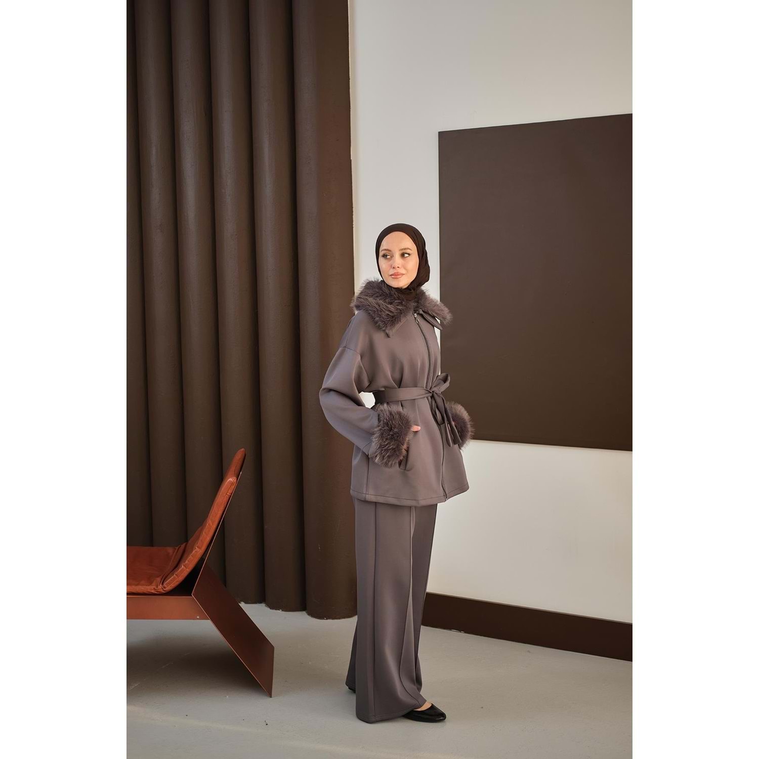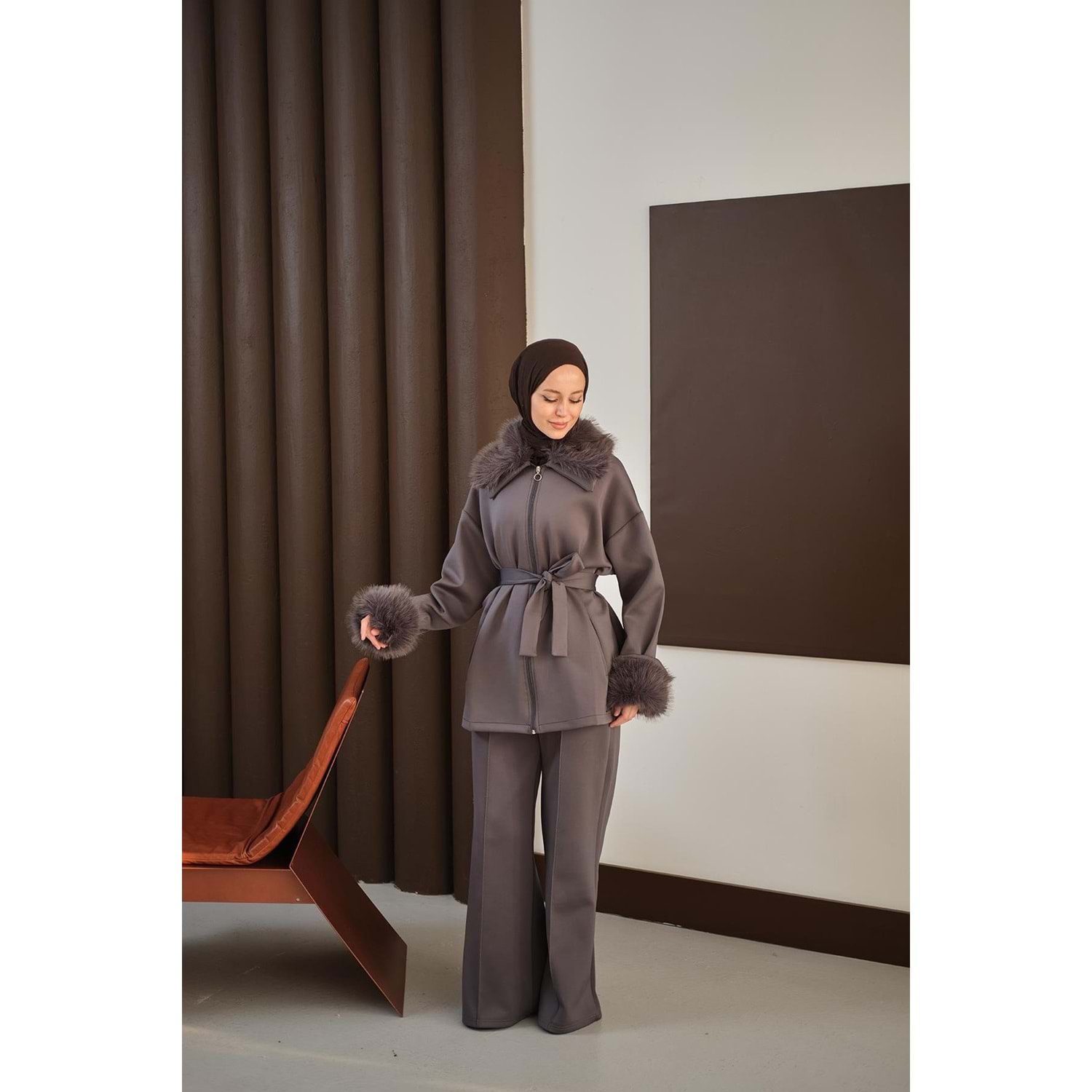 antrasit scuba takım 40 beden, antrasit scuba takım 42 beden, L-XL beden kürk detaylı takım, 40-42 beden tesettür takım, antrasit ikili takım L-XL, kürk yakalı scuba takım 40 beden, kemerli antrasit takım 42 beden