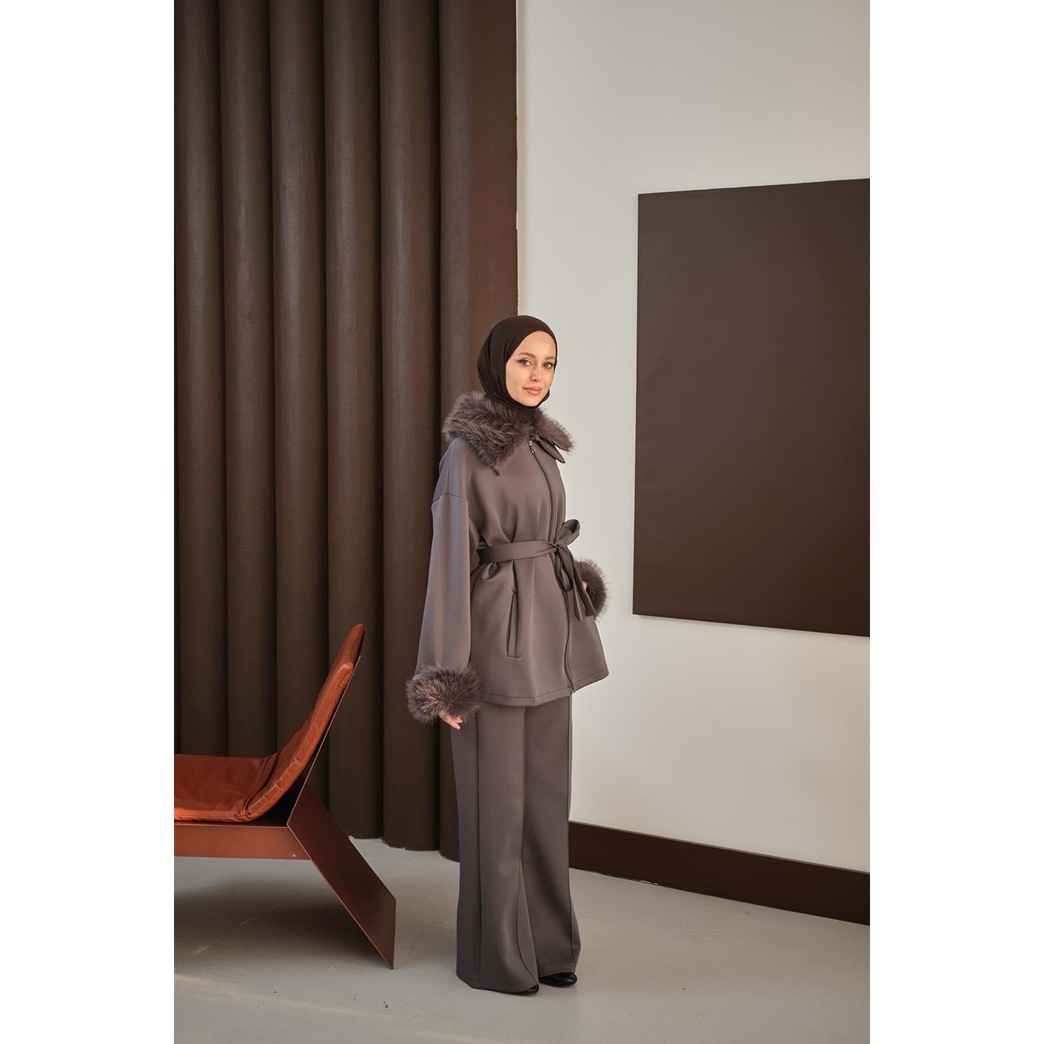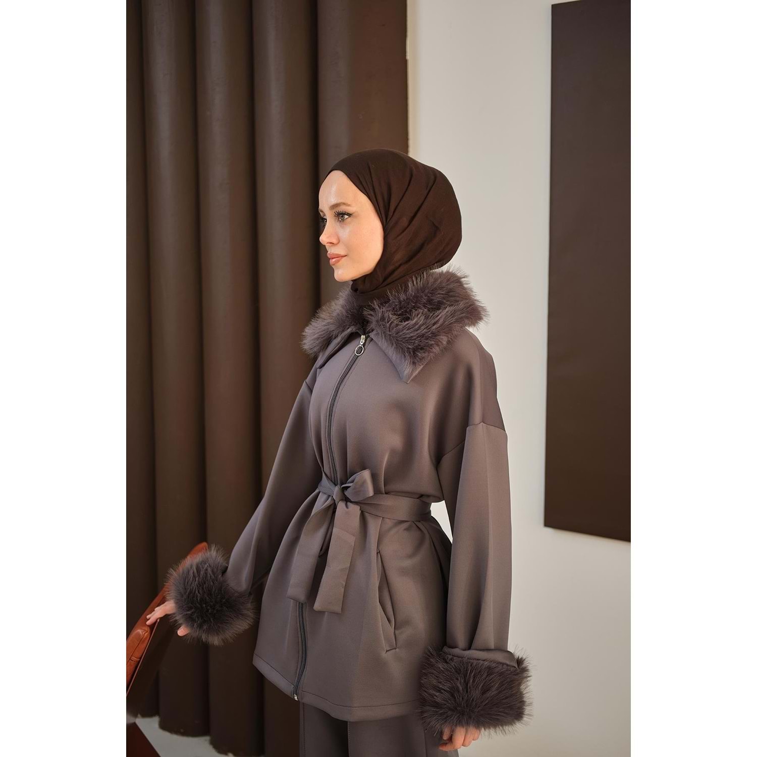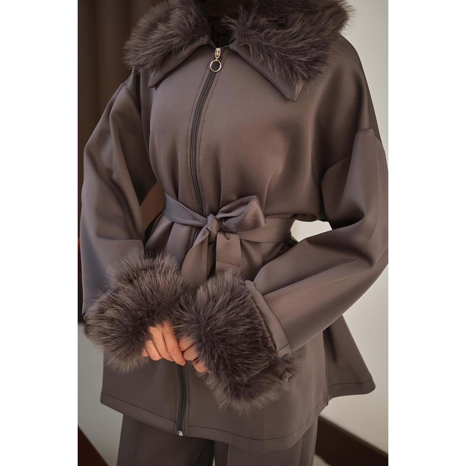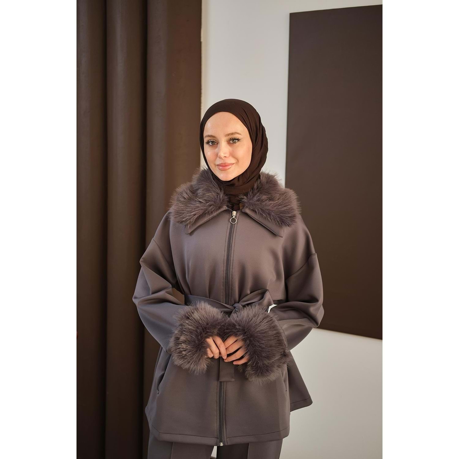 antrasit scuba takım 40 beden, antrasit scuba takım 42 beden, L-XL beden kürk detaylı takım, 40-42 beden tesettür takım, antrasit ikili takım L-XL, kürk yakalı scuba takım 40 beden, kemerli antrasit takım 42 beden