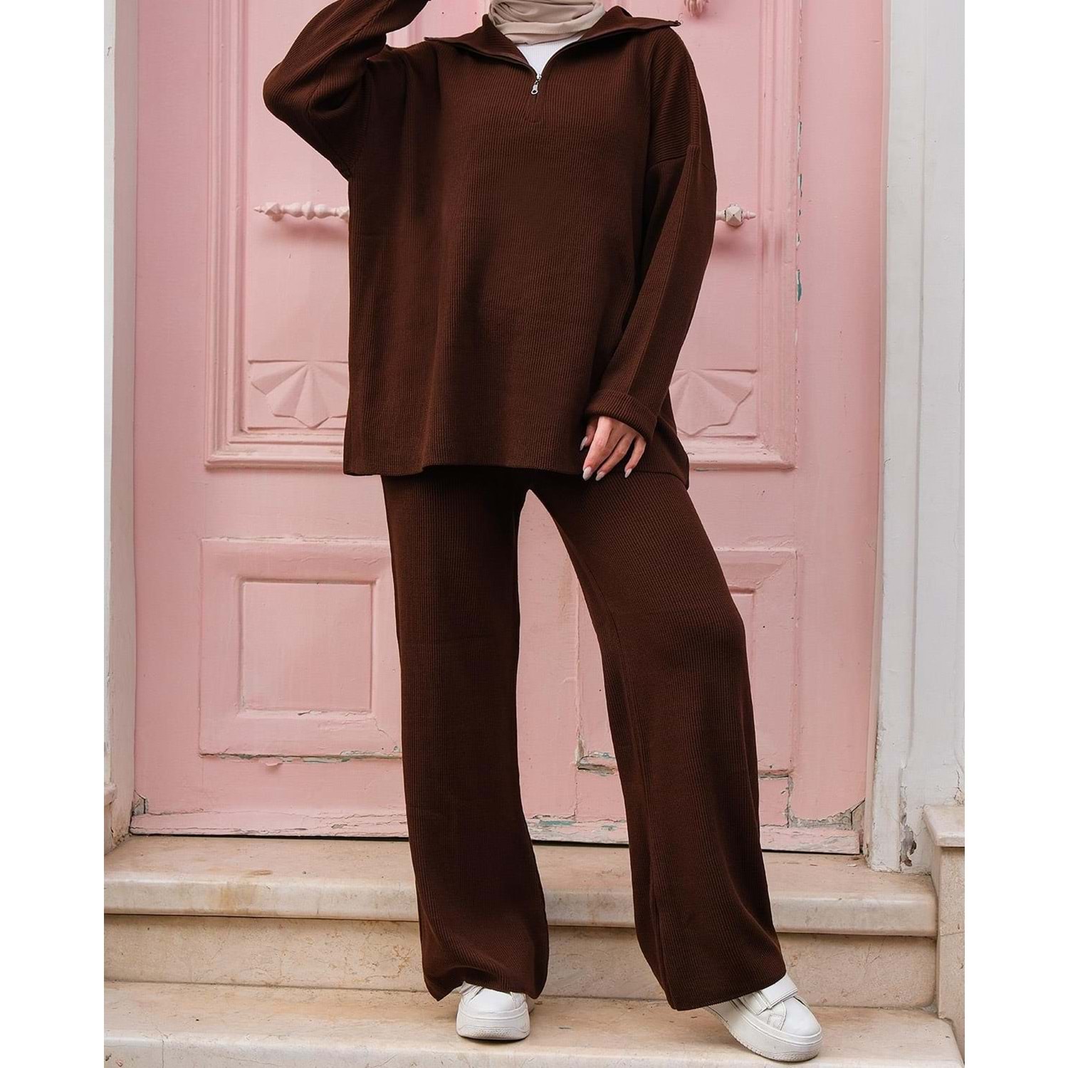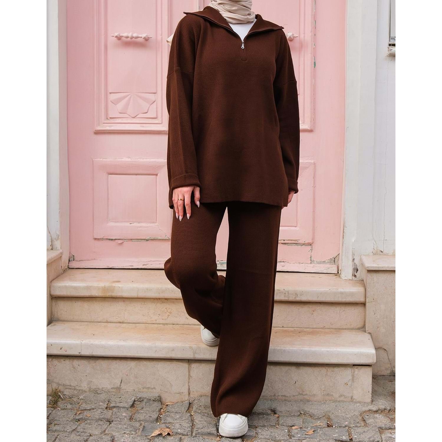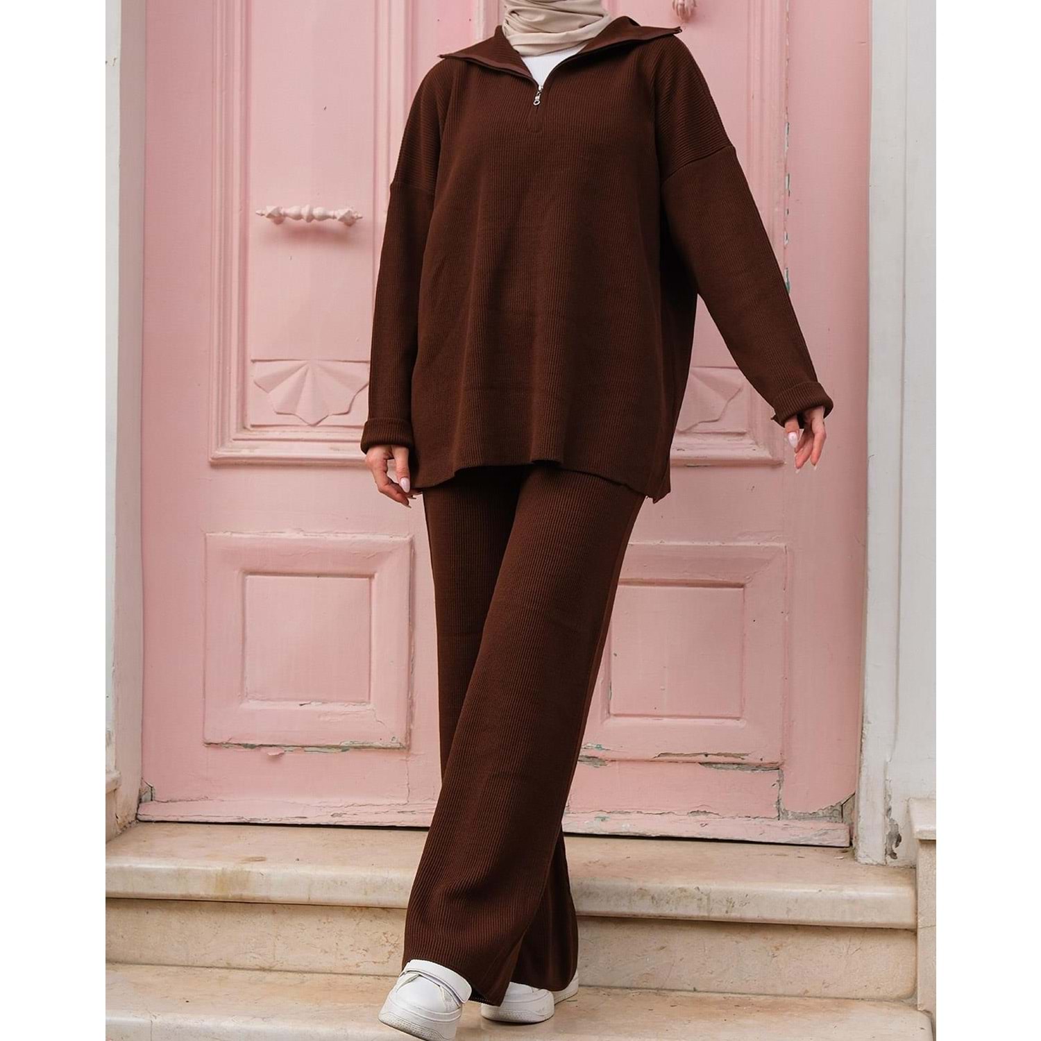 triko takım, fermuarlı triko, kahverengi triko, standart beden takım, kadın kışlık takım, fitilli triko, oversize triko