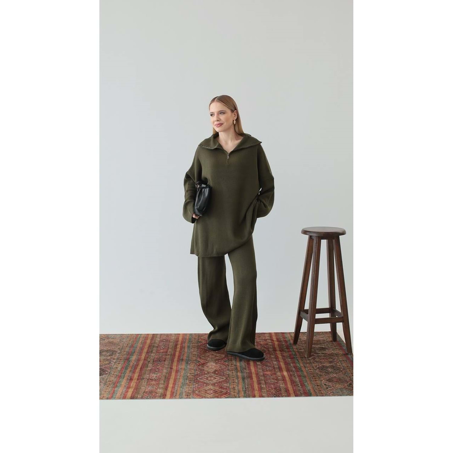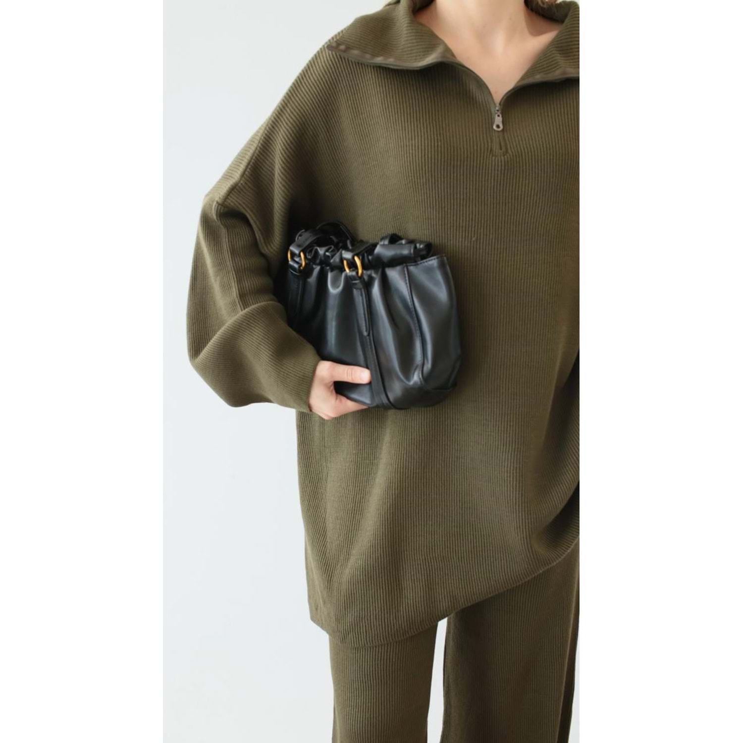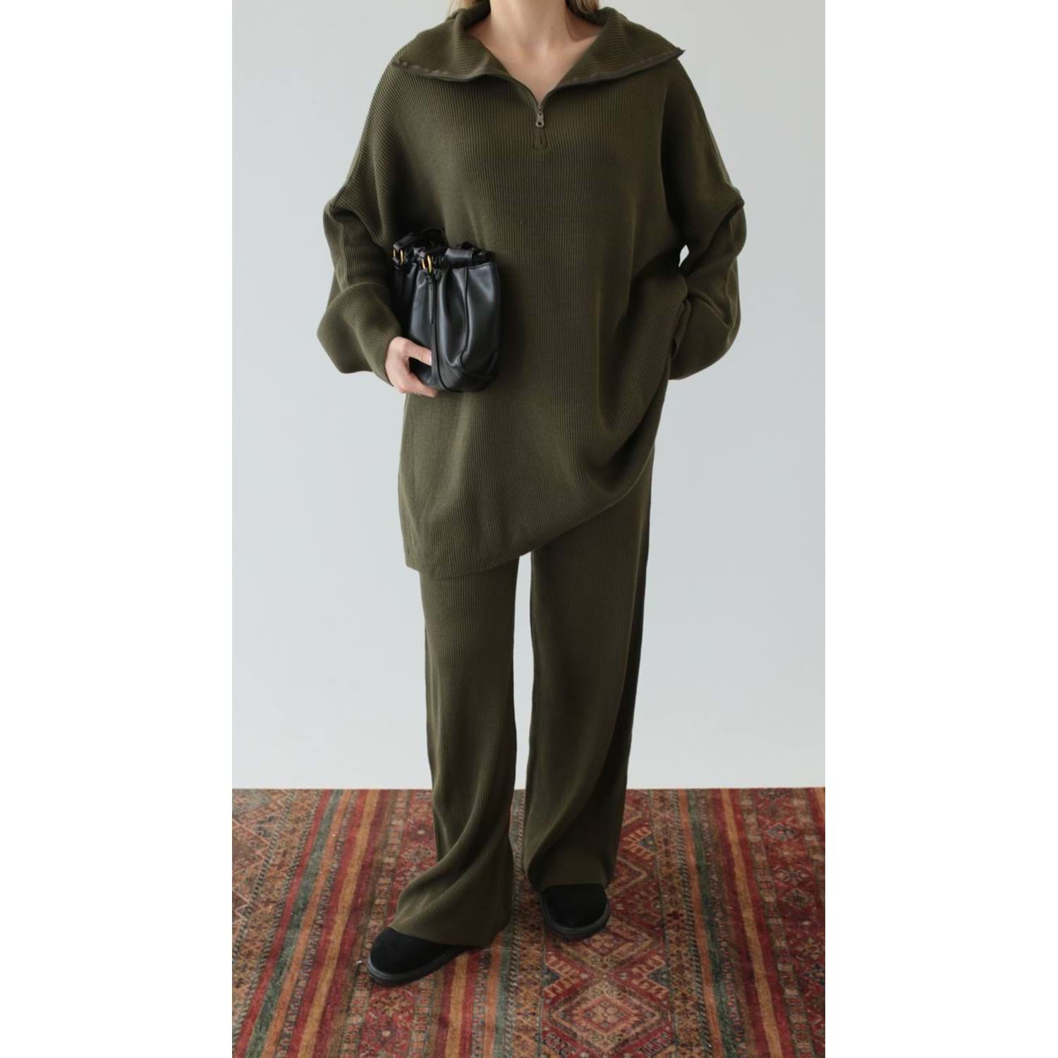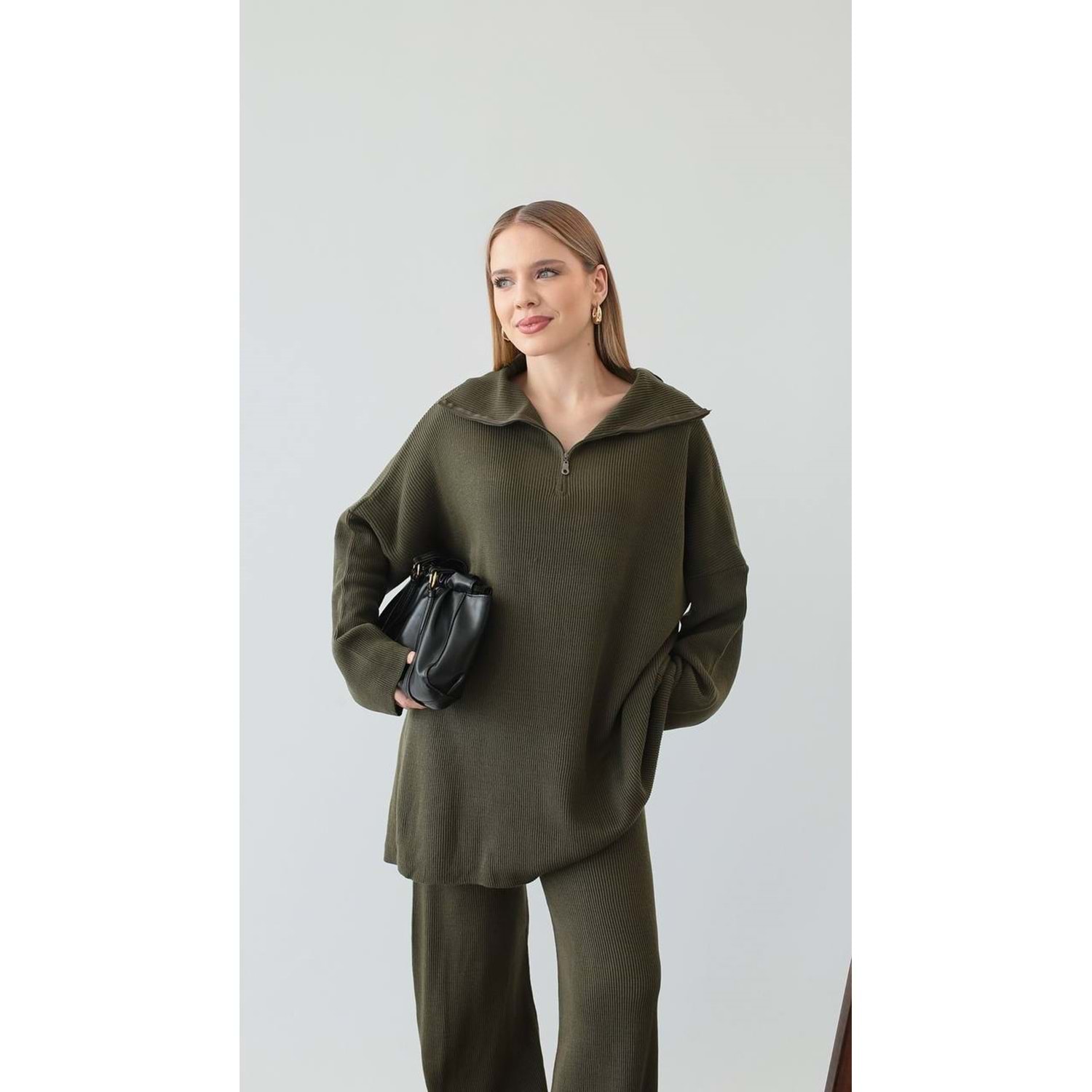 triko takım, fermuarlı triko, yeşil triko, standart beden takım, kadın kışlık takım, fitilli triko, oversize triko