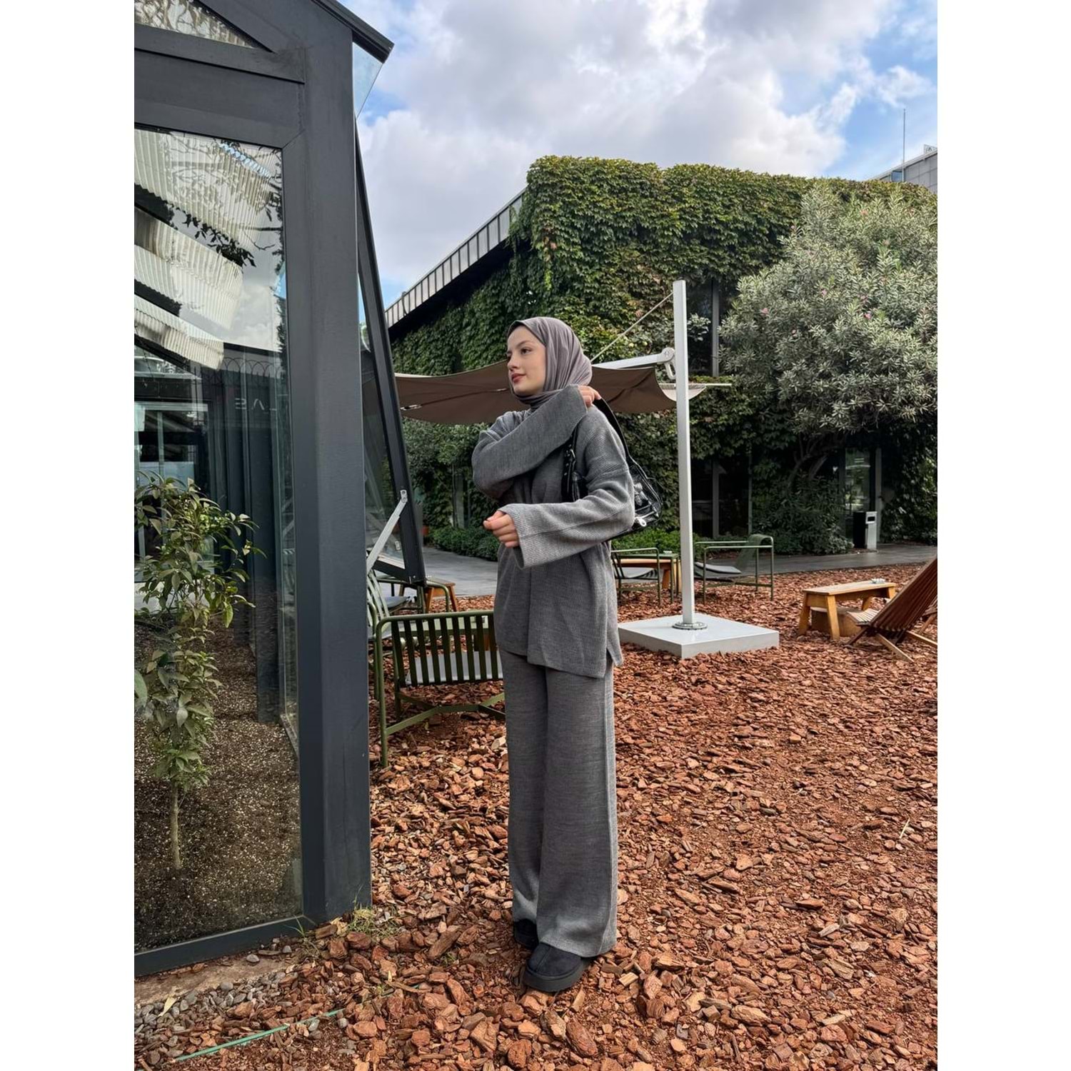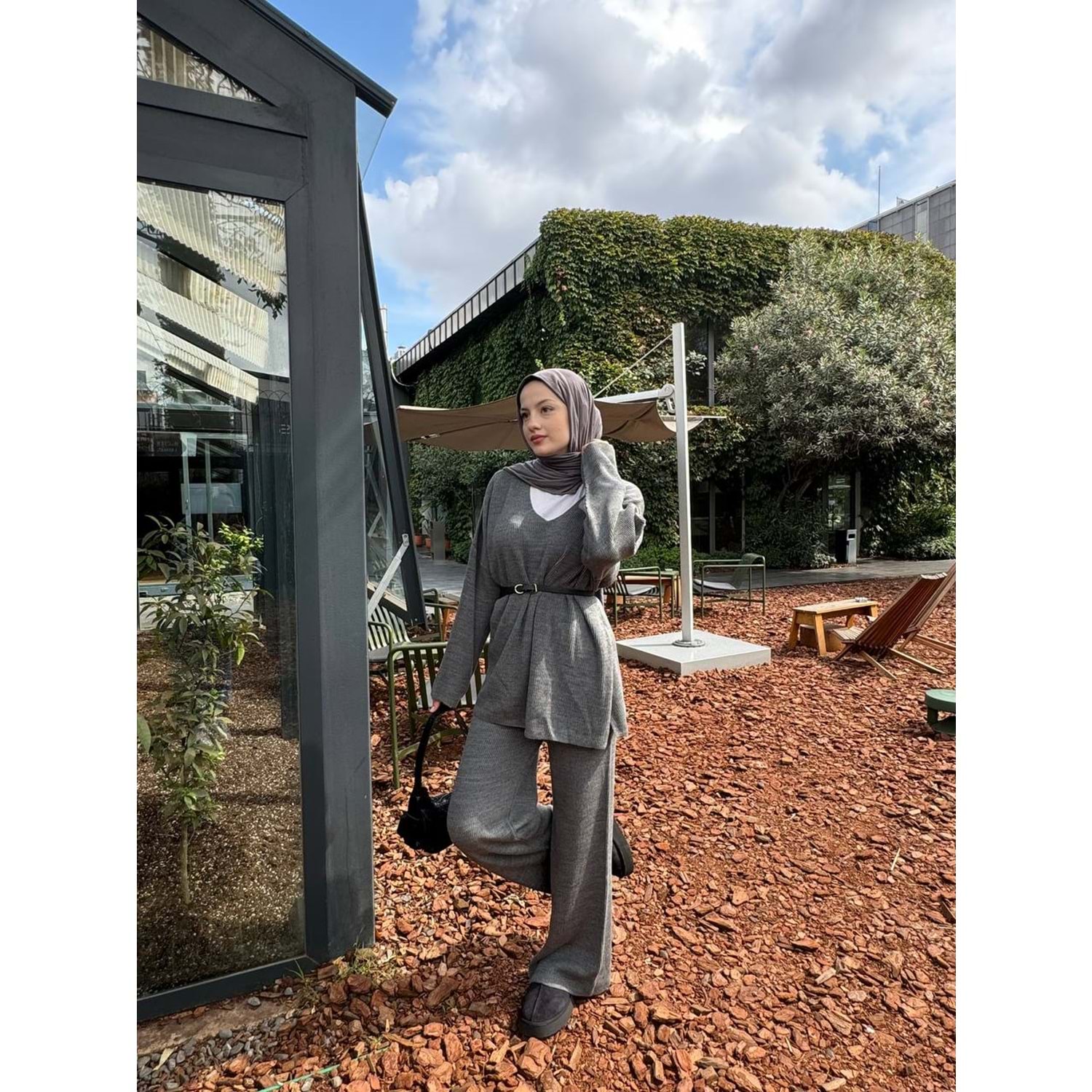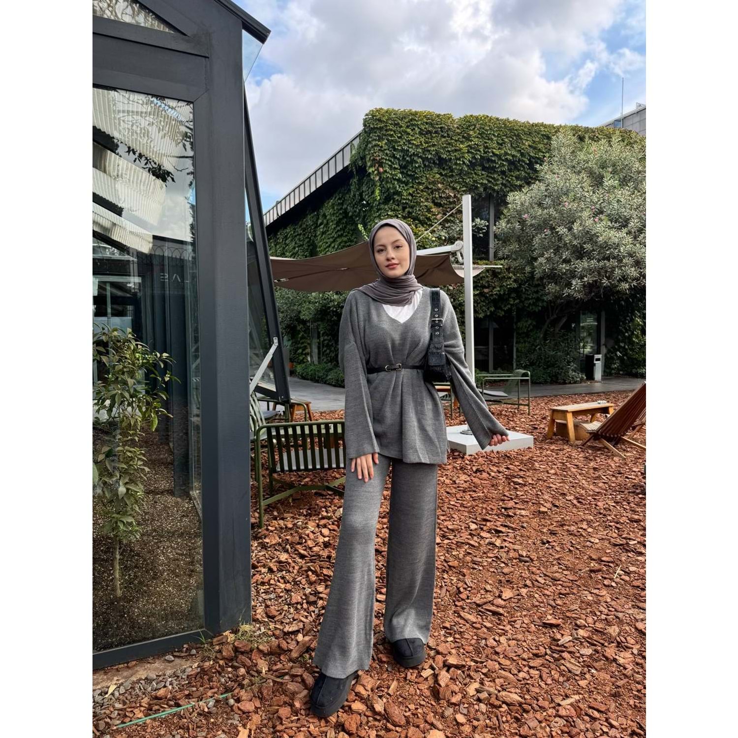 Gri Triko Takım, V Yaka Triko, Rahat Kesim Takım, Kadın Triko Pantolon, Örme Takım, Tesettür Triko Takım, Melanj Gri Takım, Kışlık Takım
