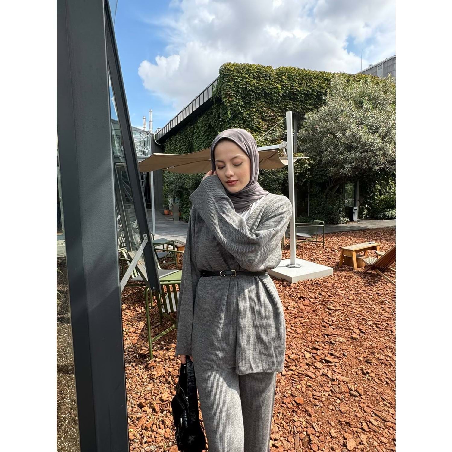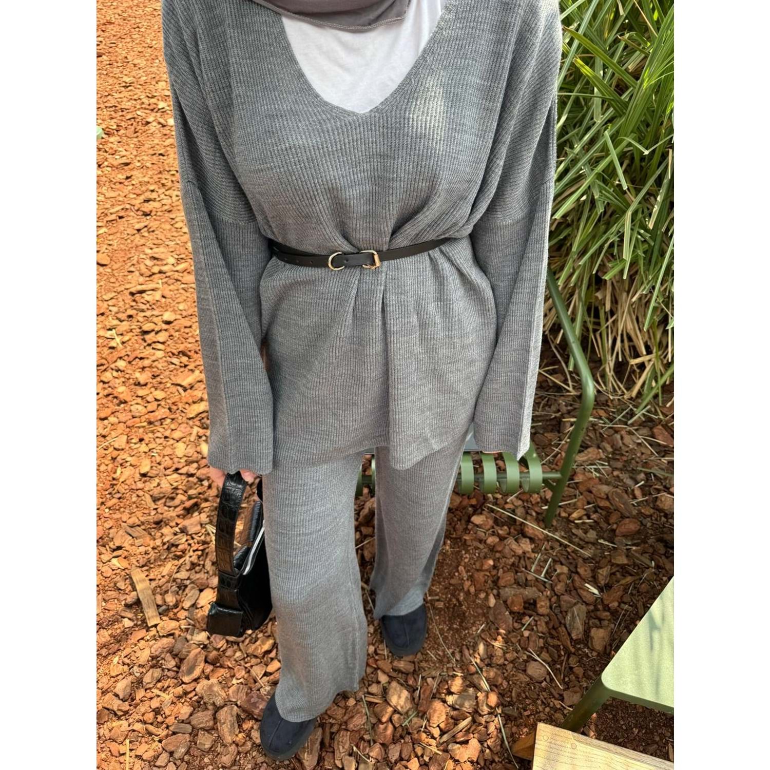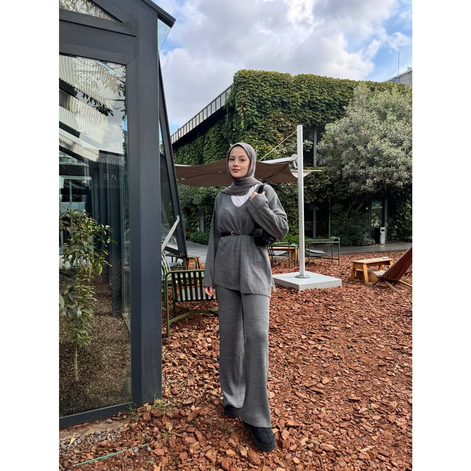 Gri Triko Takım, V Yaka Triko, Rahat Kesim Takım, Kadın Triko Pantolon, Örme Takım, Tesettür Triko Takım, Melanj Gri Takım, Kışlık Takım